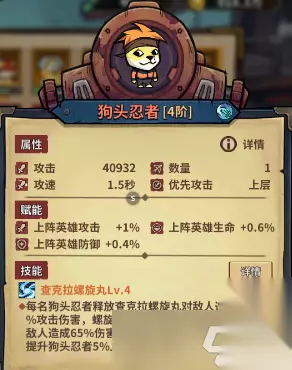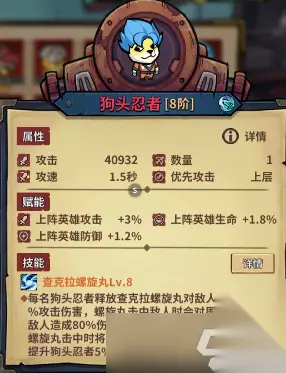狗头忍者 颜值:★★★★☆ 强度:★★★★☆ 颜值介绍:掉入木叶村的宇宙生物狗头赛亚金。 强度介绍:龙续半天才打1码,忍者搓个螺旋丸直接打2码,还带退条,但实际输出不如龙高。 特别介绍:打boss收益最大化,这buff数值放pvp有点不够看。