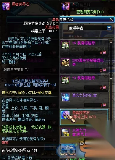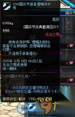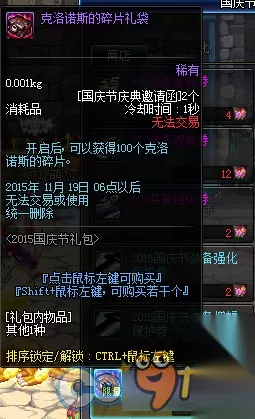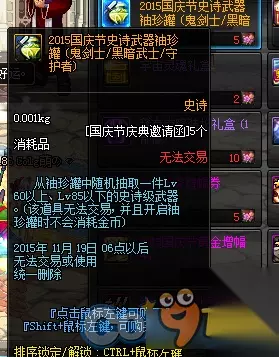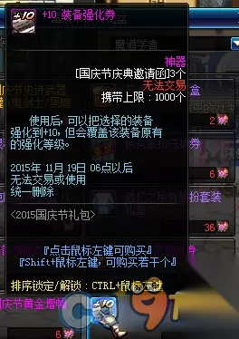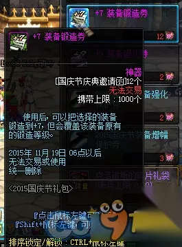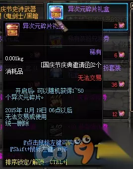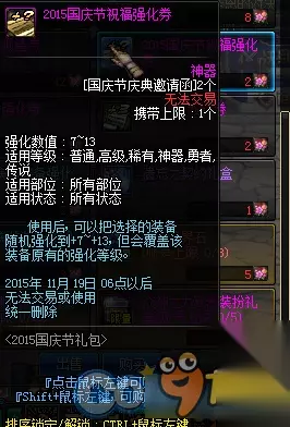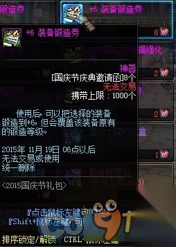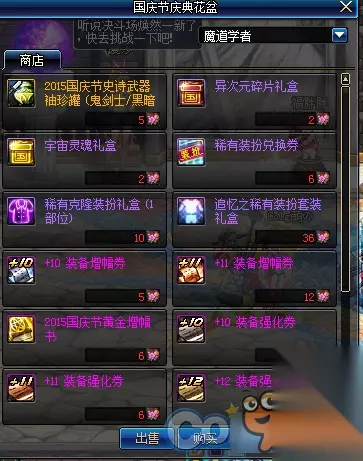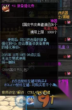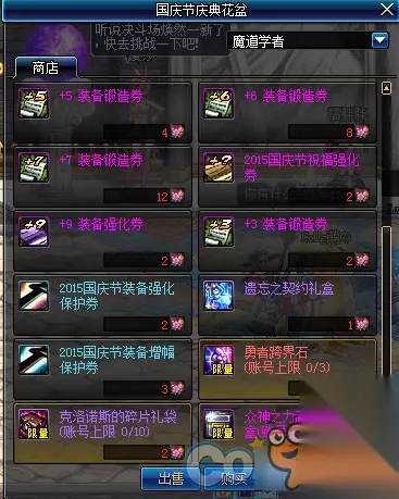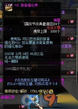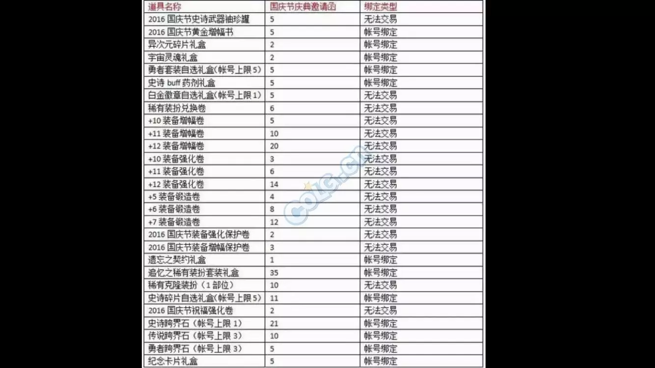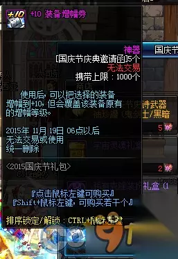 1、史诗武器袖珍罐新增魔枪士武器罐,(ps:如果2016国庆出花篮的话) 购买一套2015国庆套338档可以获得5张国庆节庆典邀请函,可兑换各种丰富奖励,史诗罐子每天刷新(TYF可开85SS)
