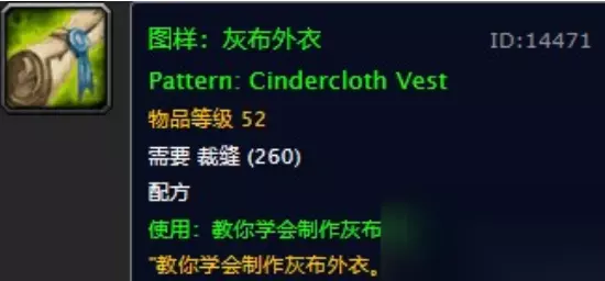灰布外衣配方: 灰布外衣能够增加玩家的11点精神以及24点火焰伤害。 适合火毁术士以及火焰法师使用,虽然和职业的虚空法袍差了不是一点半点,但是贵在40多级就能用。 40级左右的时候火毁刚好能够成型,配合上一套灰布来练级玩起来还是不错的。 灰布外衣图纸掉落地点