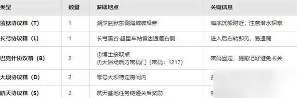 二、8个协议箱位置 1、监狱协议箱 (T):潮汐监狱东侧海域沉船旁,需潜水探索。 2、长弓协议箱 (L):长弓溪谷·超星车站雷达通道右侧,进入后右转即可。 3、巴克什协议箱 (B) ×2: 博士接取点附近。 大浴场后方密码门(固定密码1217)。 4、大坝协议箱 (D) ×2:零号大坝特定房间,常在控制室或电力房内。 5、航天协议箱 (S) ×2:完成航天基地任务链后获取。 协议箱为固定刷新,不存在随机掉落。