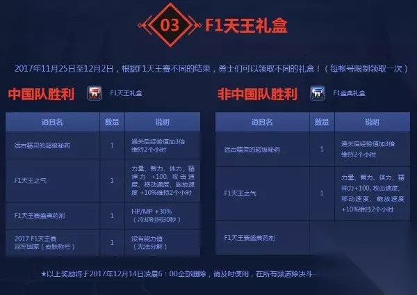 在活动期间只要在游戏内的聊天窗口发送含有”321fight“的文字,可获得buff。 重新登录和更换角色会导致buff消失,需要重新输入。 活动三:F1天王礼盒