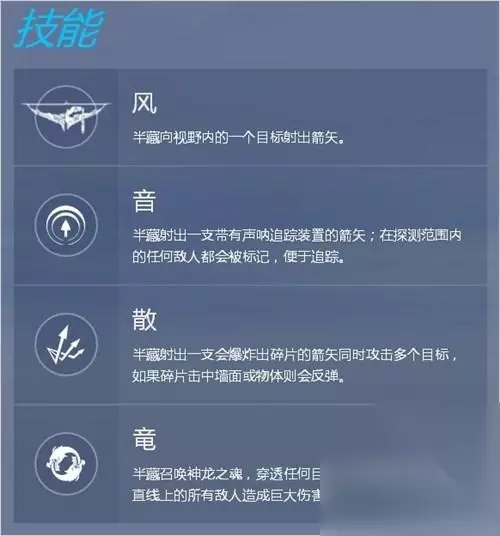 风 鼠标左键发动,单发,可以蓄力,威力随着蓄力而增长,满格蓄力时间为0.5秒,中近距离弹道平稳,远距离箭矢会受重力影响而下坠。 在与黑百合的对比上,半藏在蓄力满格时间(0.5s)比黑百合(1s)少了一半,而满蓄力的伤害(125)只比黑百合满蓄力(150)低了六分之一,且不蓄力的情况下单发伤害高于黑百合。因此理论上的DPS半藏的秒伤是比黑百合要高的。 但是在远距离战中,半藏没有倍率瞄准镜导致了在狙击时难度比黑百合更高且距离越远越明显,而箭矢的飞行轨迹受重力影响更降低了远距离狙击的精度。因此半藏相比黑百合这种远距离狙击,中距离是他的优势,中距离狙击可以一定程度上回避这两个缺点。 但是现在最大的问题在中距离面对敌人突击型英雄突脸,半藏既没有位移技能迅速逃脱也没有自保技能保命,一旦被冲脸半藏就会处于十分不利的状况,很多时候只能选择对射,力求先行击杀对方,但是近距离贴脸对射时即使你沉着冷静且枪法过硬,你也很有可能射不过…… 音 按shift键发动,带有声呐探测装置,可以探测以箭头为圆心球型范围内的敌人动向(透视)。 战术性技能,一方面肯定是便于自己预瞄掩体后的敌人,另一方面很重要的是观察敌人的动向后对于自身状况的分析决定下一步的行动该进还是退,同时和队友共享透视效果,助攻队友。非常重要的战术性技能,应尽可能的频繁使用,不仅是方便自己狙击,还因为其透视效果的助攻价值很大,是很强力的辅助技能。 PS1:附带声呐的箭与普通的箭矢伤害相同。 PS2:在持续时间内箭矢会插在目标地面/墙面/物体/敌人身体上并随之移动。 散 E键,分裂箭,箭矢在第一次命中后会分裂为多个箭头,每个箭头在接触到墙面地面以及物体时都会造成伤害并进行弹射。 由于分裂箭的复数箭头以及弹射特性,越是在狭小的房间和通道内,发挥的威力就越大。因此此技能多用于杀伤室内的敌人,在空旷的室外此技能意义不大。在室内遭遇敌人时,起手一个E能为你带来一定程度的优势甚至直接击杀敌人。 竜 Q键最终奥义,也是大家经常调侃的对象“竜が我が敌を喰らう!”,召唤神龙对行进路径上的敌人造成巨额伤害。(1.5秒施法) 箭矢刚离弦后的箭头部分为实弹(物理)伤害,因此可以被DVA的防御矩阵击落以及源氏的闪反弹,一旦被击落/反弹其后的双龙也会消失/反射。 双龙部分为能量(魔法)伤害,可穿越一切护盾和屏障(以及实体墙壁),也无法被击落/反弹。 双龙的伤害为高额持续伤害,而非接触瞬间秒杀,因此如果处于龙的边缘,即使被蹭到也有机会立刻跑开 总的来说还是一个很强的大招,虽然飞行速度有点慢但是伤害很高范围也大。无论是清除据守的炮台堡垒,还是消灭室内/通道内的敌人,或者击杀车辆附近的敌人并迫使他们远离车辆效果都非常好,也是枪法不行的菜鸡半藏的主要杀敌手段。 大招的释放时机以及位置十分重要,是能决定你的大招能不能上最佳镜头的。由于其飞行速度较慢,在敌人正面使用大招很容易被敌人躲过。距离远了会给敌人充足的时间躲闪,距离过近则会在施法过程中被击杀/控制或者被击落/反射。基本好的大招都是穿墙释放的,搭配E键的“音”技能,穿墙大可以安全的在墙后释放。墙后施法可以保证施法过程中自身的安全以及确保不会被击落/反射,且近距离的穿墙大不会给敌人太多的反应时间进行躲避,很容易出其不意攻其不备的完成多杀。 关于生存 半藏并无太多逃生技能,近战能力也不强,所以对他来说最好的位置是在团队靠后的位置。 一个新手很容易犯的错误是爬到高地后进行攻击而不转移阵地。 高处在带来更大视野的同时也会暴露自己的位置从而被击杀。 对方死亡后的录像会给对手提供你的位置,会有人专门绕后 去击杀半藏的。 一个有团队掩护的半藏会对敌方造成极大威胁。通常狙击手都会很拉仇恨。 爬墙也能用来逃生,快速翻越墙壁会使敌方丢失视野然后放弃追杀。 如果不得不进行近身攻击,请善用E对对方进行耗血,不要蓄力攻击。卡CD使用“V”进行近战攻击。 冲锋陷阵不是半藏的职责所在,除非不得不护送车和占领要点,不要深入战场。 同时不要为了追杀某个人太过深入战场。 不要在任何一个地方待的时间过久。 尽量不要暴露在对方黑百合的视线中。 关于被克制 莱因哈特,温斯顿 这两个有护盾的坦就跟乌龟一样,开了护盾之后半藏完全无从下手。 攻击打在护盾上不疼不痒。当然对方也没太好的方法击杀半藏。 黑百合 狙击手对狙击手总是步步危机。 一般来说黑百合对上半藏,都是半藏处于劣势方。 黑百合能用瞄准镜进行超远攻击,而半藏因为弹道原因不太好瞄准过远处的敌方。 在远程的对狙中通常是半藏会落败。黑百合的大也会让半藏无所遁形。 法老之鹰 法老之鹰这种飞来飞去的英雄不易被瞄准。 而且视野高会轻易发现半藏,伤害也极高会被法老之鹰击杀。 狂鼠 狂鼠能使用类似榴弹炮的攻击。 特别是狂鼠,可隔着障碍物进行攻击,在地形复杂的时候极易被炸死。 麦克雷 麦克雷的中程点射对半藏有威胁。 麦克雷开大后对半藏有巨大威胁,在视野范围内的半藏被麦克雷的大瞄准都会被直接秒杀。 实用技巧 1.在拐角处时,可在敌方视野外蓄力,蓄力满后冒头进行攻击。 2.作为防守方开场前赶到对方出生点门口,对着对面出场的门口蓄力,使用散,若对面不顶着盾出场,
