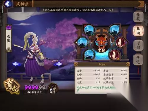 御魂搭配: 最适合的就是破势,因为大招杀人加进度条,而且单体输出一次巨大伤害的式神都适合破势,可以直接秒人(秒全队的茨木)。破势在敌人血量高于70%时,加伤40%,配合白狼大招伤害与爆伤被动收益叠加,轻松秒人并没有任何问题,而且杀人后进度条加60%几乎可以马上再次进行击杀(只要有火) 白狼其实也有另外几个冷门的御魂搭配 如果你对你的伤害足够有信心能秒对面 那么在鬼火充足也就是说自带童子的时候轮入道也可以拿来玩玩 当然暴击什么的都要调整但是这样伤害会低很多 只能欺负欺负脆皮 还有一种带印摩罗击杀后回火 靠辅助和自身的带动完成一回合多次击杀 然而因为牺牲了15%的暴击所以御魂整体属性也要调整6号位可能要换成暴击 4+2套装属性换攻击 副属性堆暴击 同样不能让人看到白狼恐怖的一面 阵容选择 白狼阵容选择 单点秒人流:白狼+妖刀姬+小鹿男+山兔+阎魔 阎魔提供控制保证山兔拉条,要到白狼单点秒一个后触发小鹿男被动触发然后不断秒下去,无论是妖刀还是白狼都具有单秒后的转火能力,山兔和阎魔应尽量是火灵以保证火量充足。 白狼保茨木收割流:白狼+茨木+丑时之女+山兔+座敷童子 山兔拉条,座敷供火,座敷的速度要拉到全队的第二,否则供火上有困难,丑时之女第三位然后白狼颜射小人然后茨木+神乐疾风二连拍。 四保一单点流:白狼+老头+童男+桃花妖+椒图 椒图可以换成蝴蝶精,典型的四保一阵容,靠轮入道白狼秒一个脆皮后全队开始龟,白狼由被动就来一发,没被动就继续普攻装死,非常克制速攻一波流的茨木阵容。 速度选择 很多人想知道白狼到底带不带速度御魂? 其实白狼带不带速度取决你白狼是收割还是打先手 在有拉条的情况下,白狼的2号位御魂可以带攻击, 这样可以让白狼伤害最大化。
