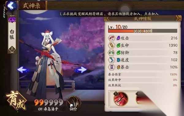 白狼 入手途径 1、百鬼砸碎片 2、委派任务给碎片 3、结界卡给碎片 4、御魂奉纳也有概率产出碎片。 5、直接抽出完整的 白狼有着天生的属性面板优势,是一个入手门槛非常低的SR式神,但是伤害丝毫不弱于任何SSR式神。 技能解析 我们首先对技能进行分析 普攻:伤害方面平平无奇。 技能: 1、文射,普攻,对目标造成攻击100%的伤害。 2、冥想,被动,回合结束时有30%提升下回合20%的暴击伤害。配合这个被动,可以很好的使用主动技能。 3、无我,3火,造成237%的伤害,并此次攻击的暴击率提升30%。这招的暴击概率极高,配合被动可以打出秒杀的效果。 主要输出伤害为3技能,同时3技能对暴击的要求也很高。
