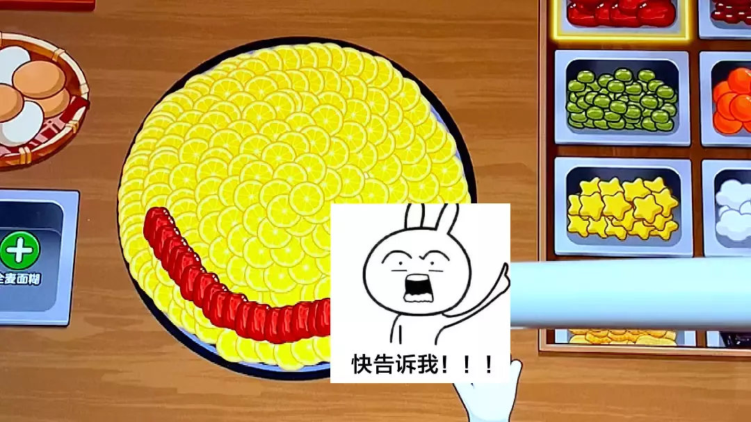 这是《我的煎饼摊》游戏日常分享,展示了在游戏里用食材在煎饼上创作图案的玩法,还提及有玩家找不到对应图案,分享了游戏里的趣味互动。