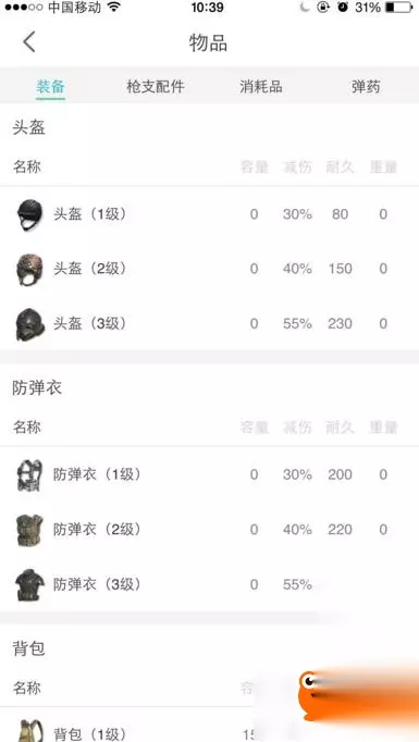 2、物品可以看到最新的装备、武器配件装备、血包药品和弹药。