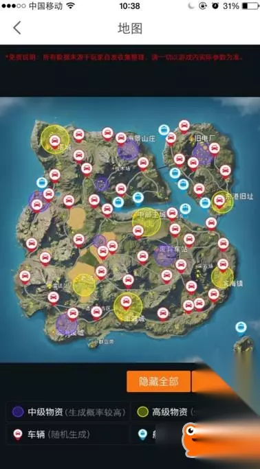 3、地图目前是最全的地图资源点信息,可以看到中级物资刷新点位、高级武器刷新点位、车辆刷新点位和船只刷新点都有很全。