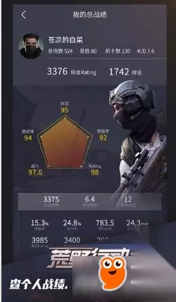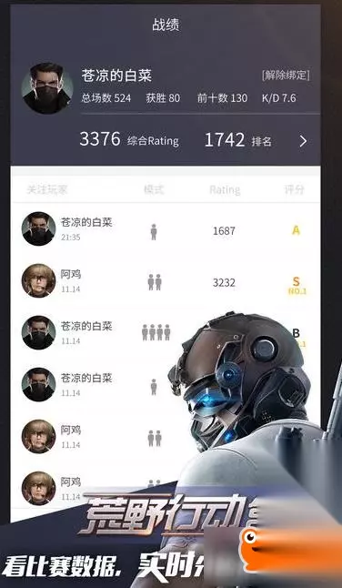 4、战绩中你可以看到你关注的队友战绩成绩,有战绩模式、Rating、战绩排名和战绩评分,每一局比赛都有战绩评分,当然也有全网的战绩第一名玩家评分。