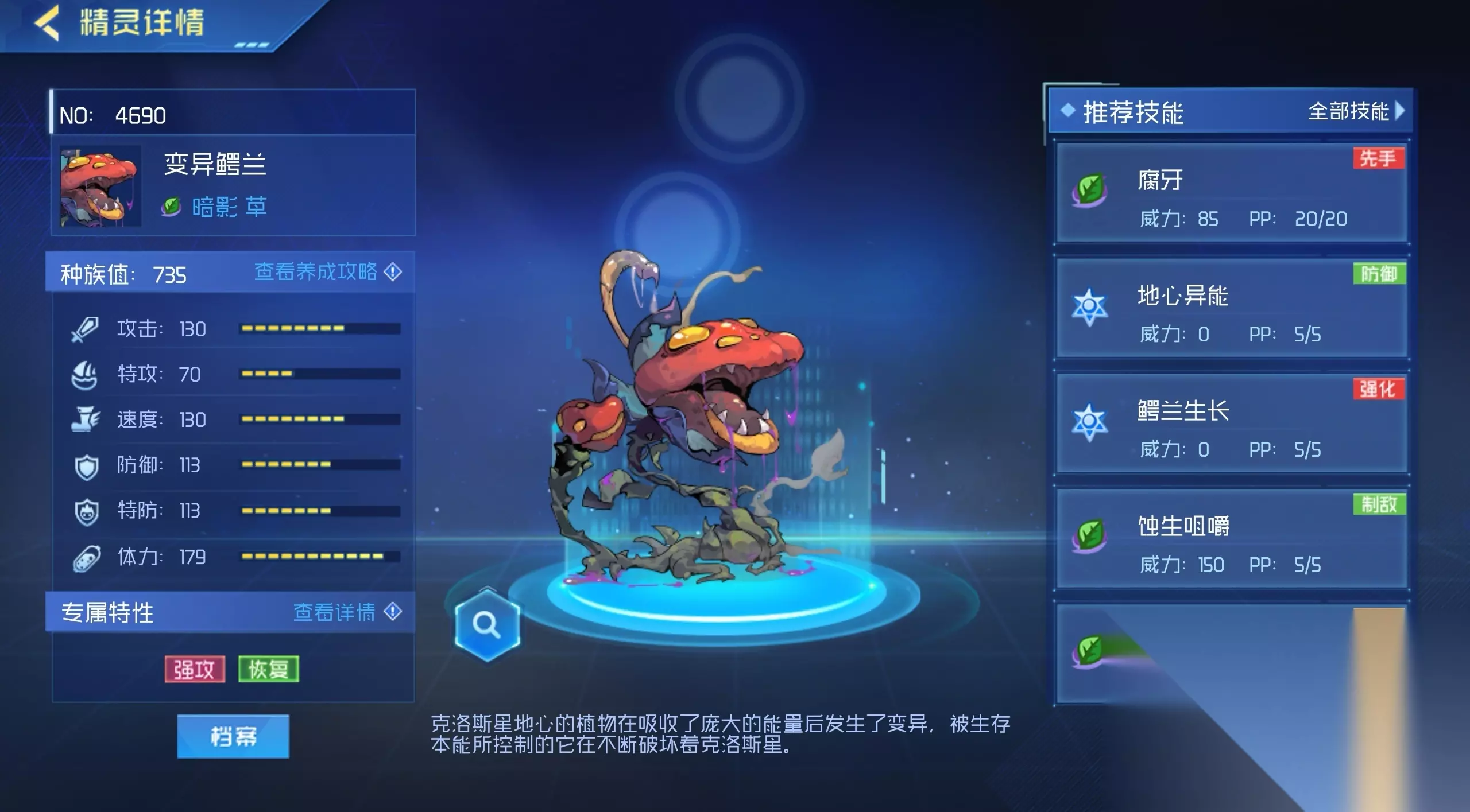 大家也可以试着将其与具有消强技能的精灵放在一起去用,当对方精灵强化过高时,先由消强精灵消除对手的强化状态,然后变异鳄兰再上场,利用腐牙进行反转和控场,进一步扩大优势。当变异鳄兰与与一些具有回血、回体或护盾技能的精灵配合时,可以保证队伍的整体续航能力,在变异鳄兰血量较低时,其他续航精灵可以为其提供支持,让其能够继续在战场上发挥作用。