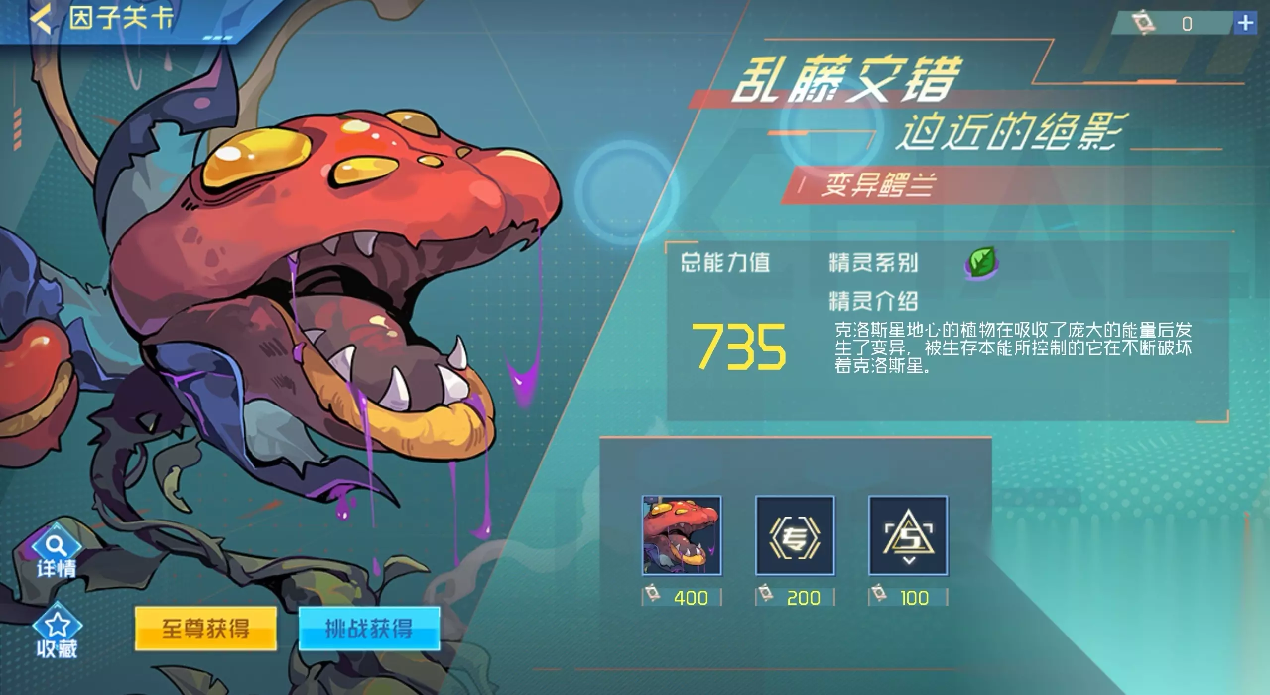 如果你正好想试试草系的精灵,那么变异鳄兰就是一个不错的选择,想要获得这个精灵的话,玩家要在因子关卡内,完成指定的精灵挑战,这个模式分为简单、困难和地狱三个难度,玩家可以根据自己的实力去进行挑战,成功击败守关BOSS后,就能得到一个数量的精灵因子,使用这个物品就能兑换变异鳄兰了。