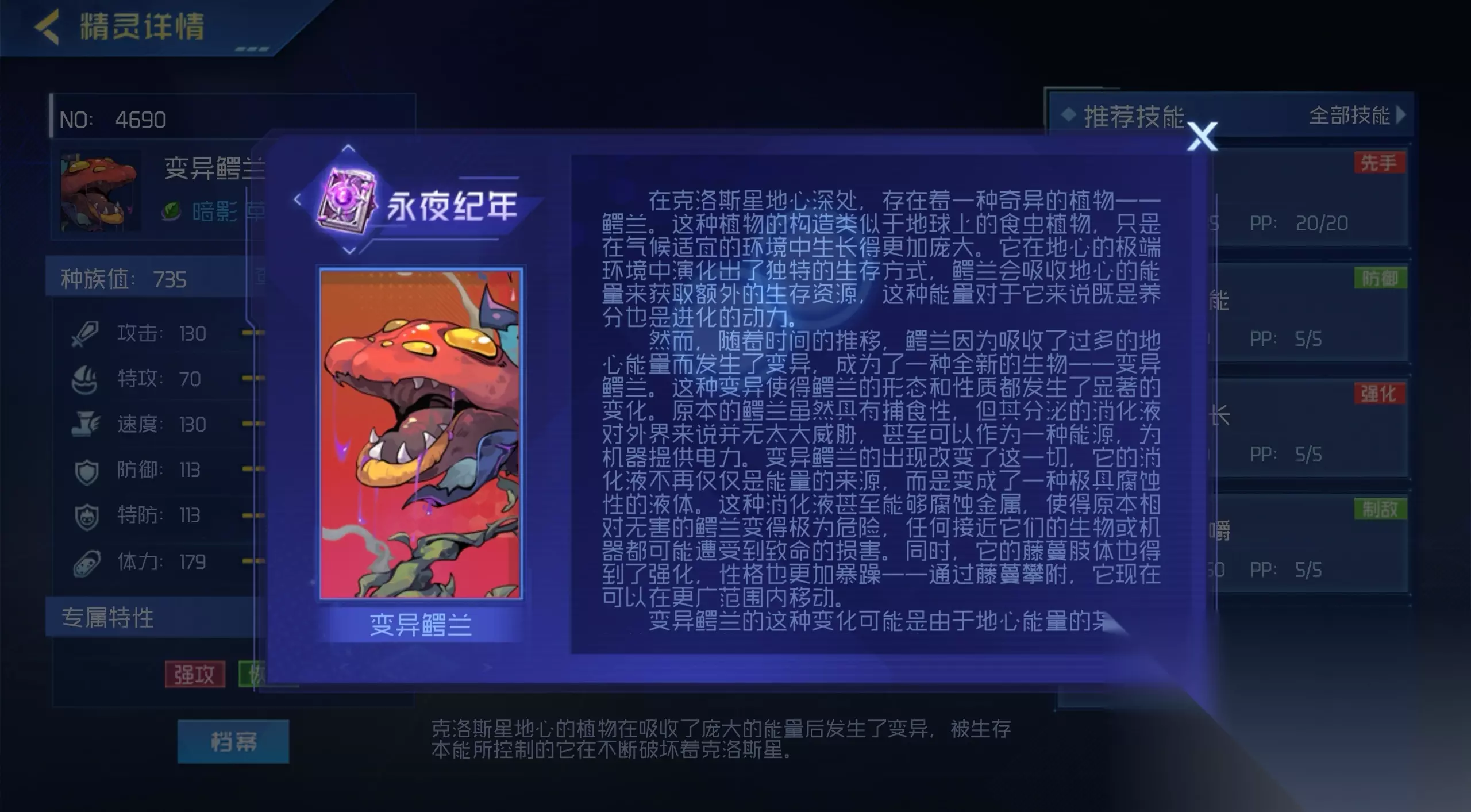 在进行实战的时候,如果对方首发精灵的能力值普遍低于变异鳄兰,或者没有明显的针对技能,可以选择首发变异鳄兰,直接使用鳄兰生长进行强化和续航,然后根据对手的行动,使用腐牙或蚀生咀嚼进行控场和输出,建立优势后再利用其他技能进一步扩大优势。在战斗的后期,当对手的精灵体力普遍较低或状态不佳时,变异鳄兰可以利用自身的技能优势进行残局收割,利用蚀生咀嚼的高概率控场和吸血效果,以及异变吞噬的伤害加成和固定伤害,就能快速击败对手。