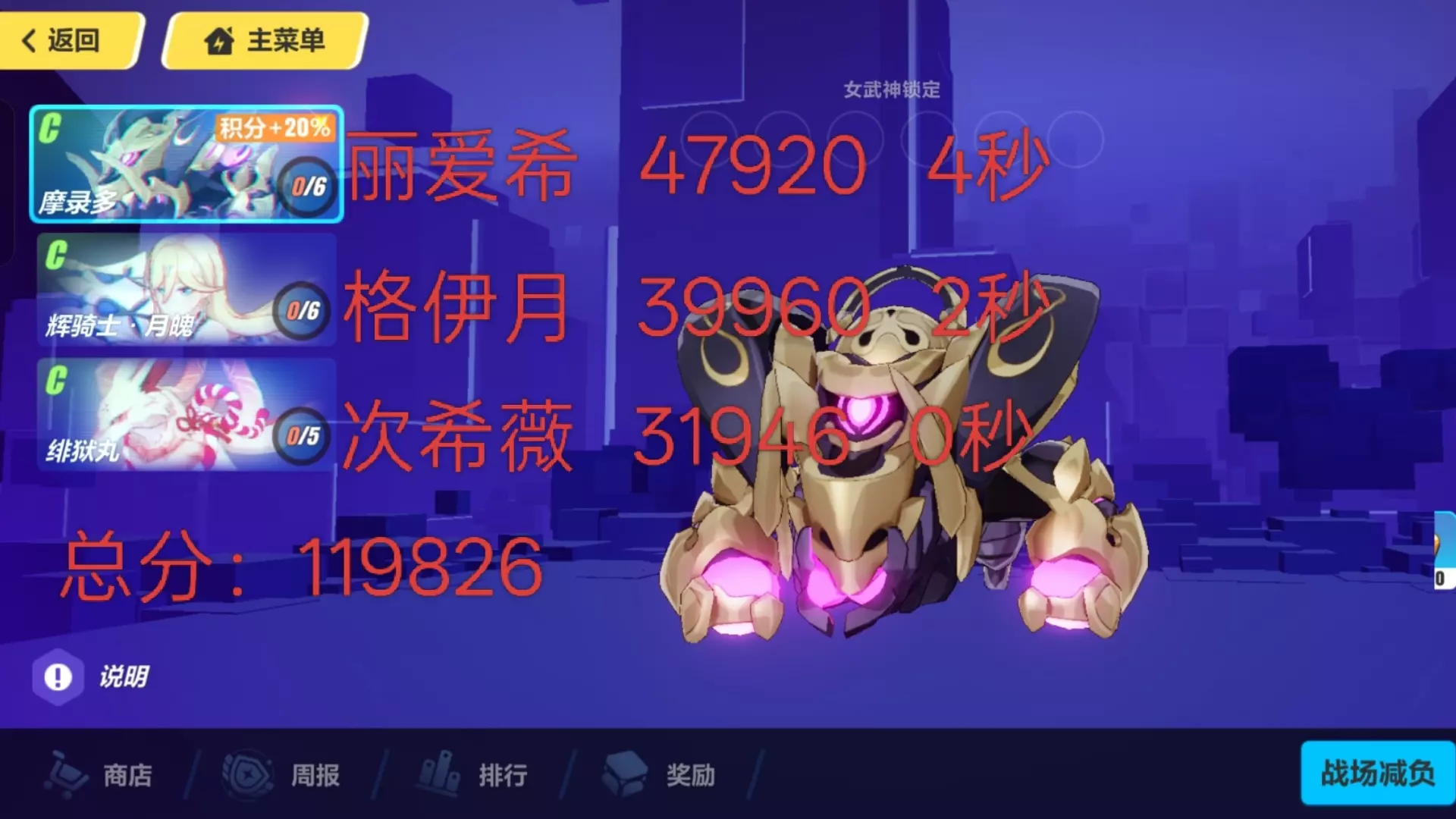 寂灭章。可以放松的一期。 =======================分界线======================= S0+1丽希爱 S晨雪 摩录多47872 摩录多还是老流程,协同换S游云一样可以打,转阶段随便蹭蹭也够了,晨雪是最低标准。 S0+1李科SS0+1月 S晨雪 月魄39960 参考流程BV1JncvzSEdg 月下可以降配,带晨雪是因为晨雪初始环能多,可以快速开出第一个环,这样可以提一秒,伤害足够,也不需要两个超Q。凹点就是开局龙科武器不能卡太多肉,龙科空中触发慢动作后面就不会卡,触发概率挺高的,月下超Q完大招一半的时候跳58秒就能出,比较宽松。 分p带德配置高点能出960,不过没晨雪简单。 人瑟 寻梦者 绯狱丸31946 没希娜也随便打,可以带个松雀或者灯之类的当挂件伤害更高。
