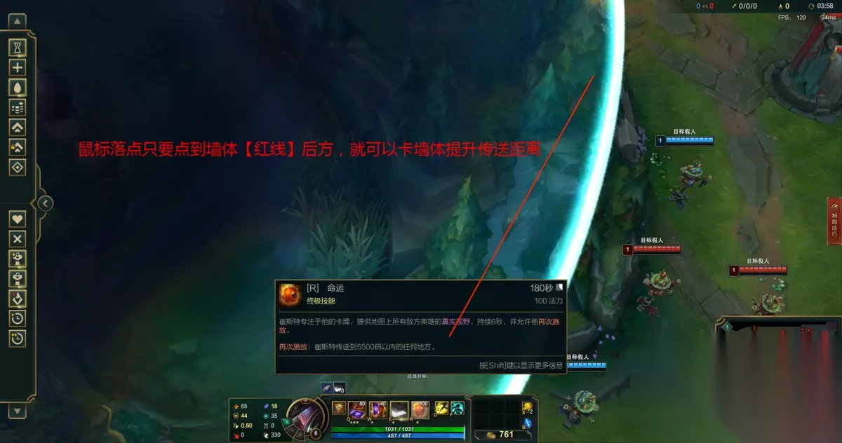 【提供敌方英雄真实视野】 释放技能时会提供地图上所有敌方英雄的真实视野,持续6秒 【传送】 再次释放后崔斯特可以传送到5500码以内的任何地方 限制效果会打断大招,所以开启大招传送时要注意时机,避免被打断的尴尬情况 老鼠,男刀,齐亚娜,小丑等英雄的隐身,卡牌开启大招都能够看到,打团时可以利用R技能防止他们隐身打输出 卡牌的大招会被【夜之锋刃】,【女妖的面纱】护盾抵挡,装备提供的盾会消失,但是无法提供目标英雄的视野 【卡墙R】 释放R技能传送效果时,把鼠标落点放在墙体靠后的方向,可以提升R技能的传送距离