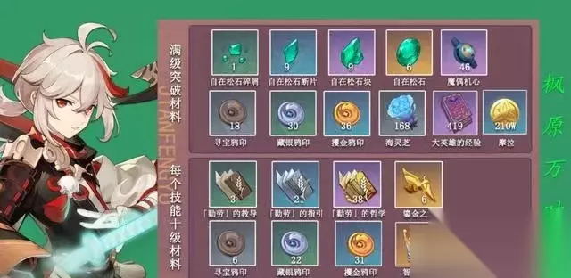 原神万叶突破材料 原神枫原万叶1-90级所需突破材料: 1、摩拉x2092530,2、海灵芝x168,3、大英雄的经验x419,4、自在松石碎屑x1,5、自在松石断片x9,6、自在松石块x9,7、自在松石x6,8、寻宝鸦印x18,9、藏银鸦印x30,10、撰金鸦印x36,11、魔偶机心x46。 原神枫原万叶天赋突破材料: 勤劳的指导*3,勤劳的指引*21,勤劳的教学*38,寻宝鸦印*6,藏银鸦印*22,㩴金鸦印*31,鎏金之鳞*6,智识之冕,摩拉。 对于角色突破来说,只要突破到80级就行,可以不用浪费经验书去升级到90级。