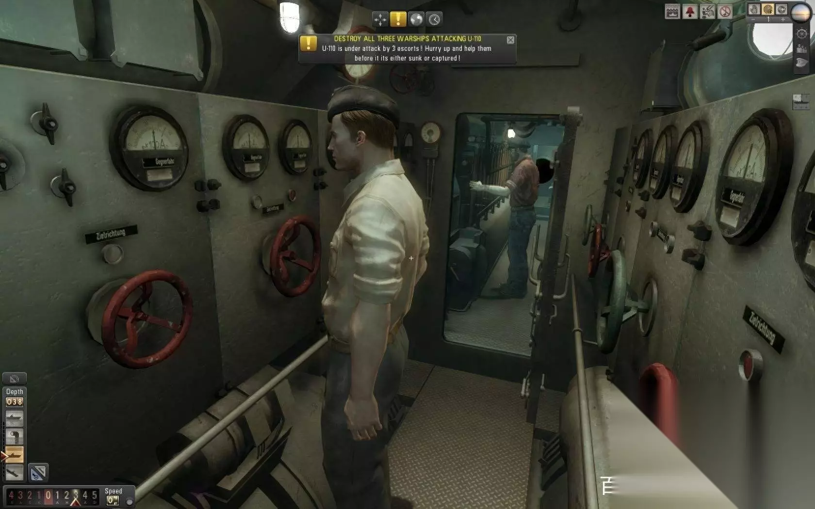 无论何种模式,你会发现自己将置身于一个U型潜艇狭小的空间。虽然不能够到处走动,不过你还是可以通过鼠标操作进入某些特定的房间。例如指挥舱、声纳室和甲板等等。为了更好地操控潜水艇,你可以命令工程师、领航员和武器操作手,仅需要对基于图标的菜单进行简单点选即可完成相关操作:比如,点选工程师,你可以令其进行无声潜航操作;点选点击领航员,执行许多不同的类型查找模式;当然,你也可以直接的控制每个部分,例如声纳领航员观察员等等。