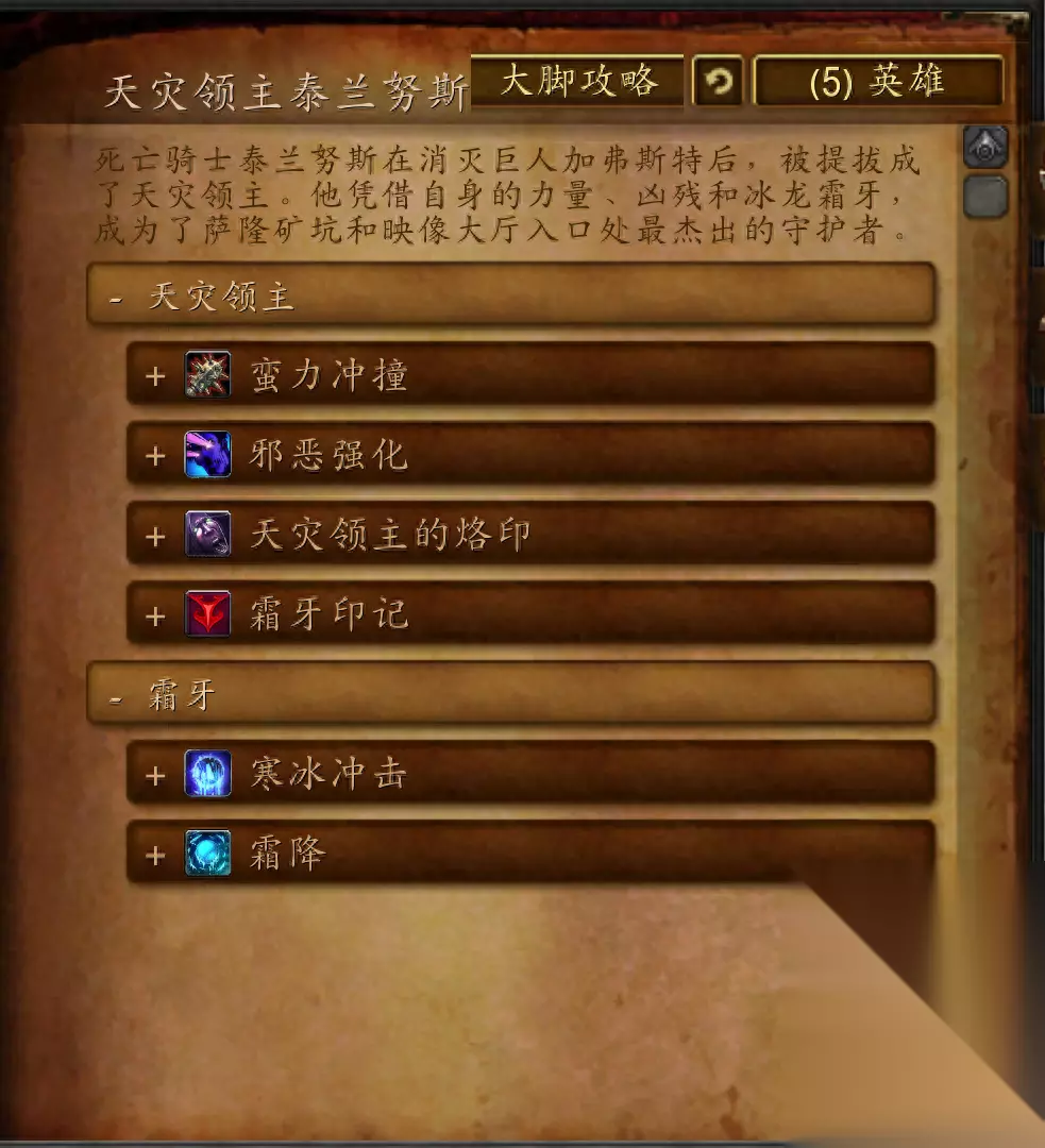 天灾领主泰兰努斯 死亡骑士泰兰努斯在消灭巨人加弗斯特后,被提拔成了天灾领主。他凭借自身的力量、凶残和冰霜巨龙霜牙,成为了萨隆矿坑和映像大厅入口处最杰出的守护者。