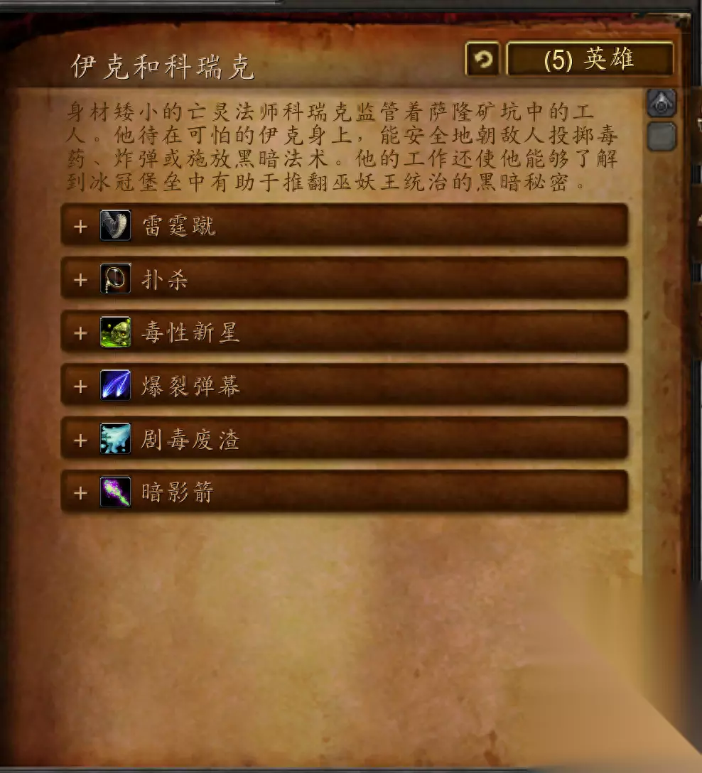 加弗斯特制造出了一些极具杀伤力的致命武器,天灾军团用它们来对付活人。他能以极快的速度将萨隆邪铁铸成带来痛苦与死亡的可怕器具,也能直接将萨隆邪铁掷向自己的敌人。 科瑞克&伊克 身材矮小的死灵法师科瑞克监管着萨隆矿坑中的工人。他待在可怕的伊克身上,能安全地朝敌人投掷毒药、炸弹或施放黑暗法术。他的工作还使他能够了解到冰冠堡垒中有助于推翻巫妖王统治的黑暗秘密。