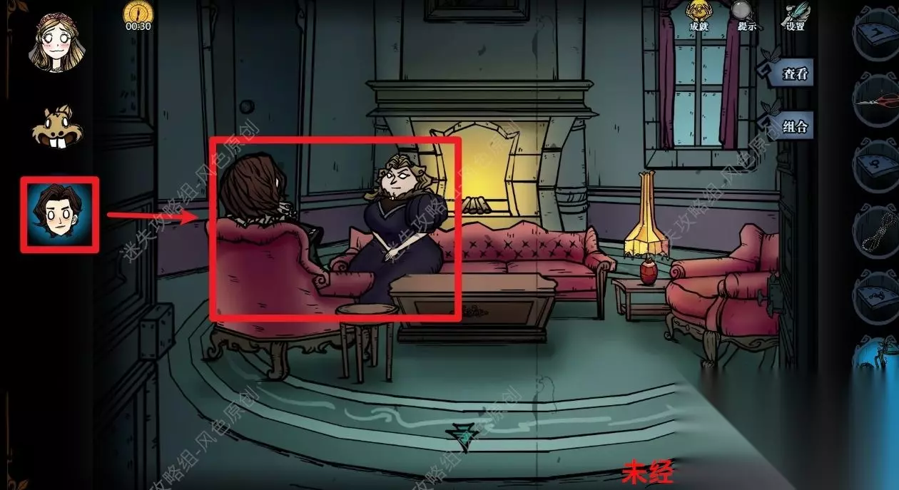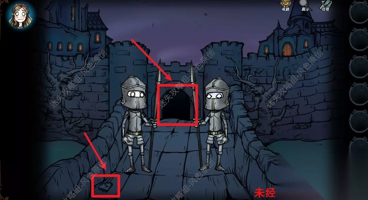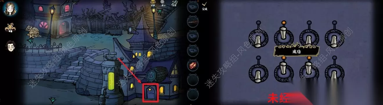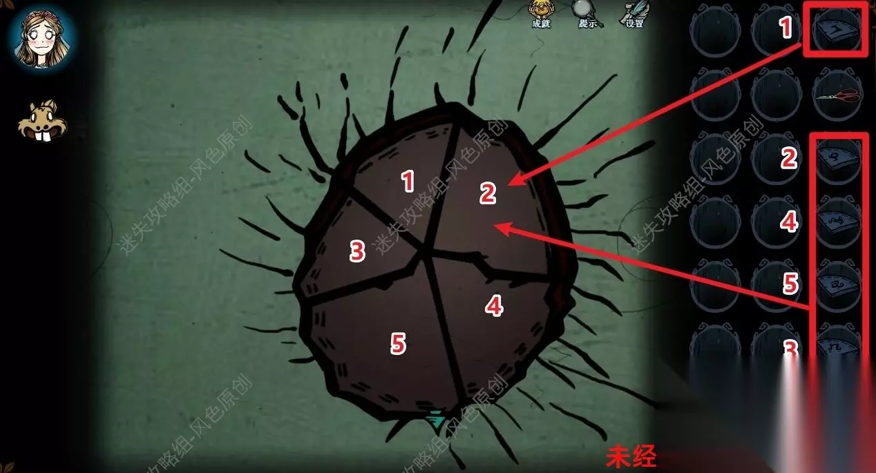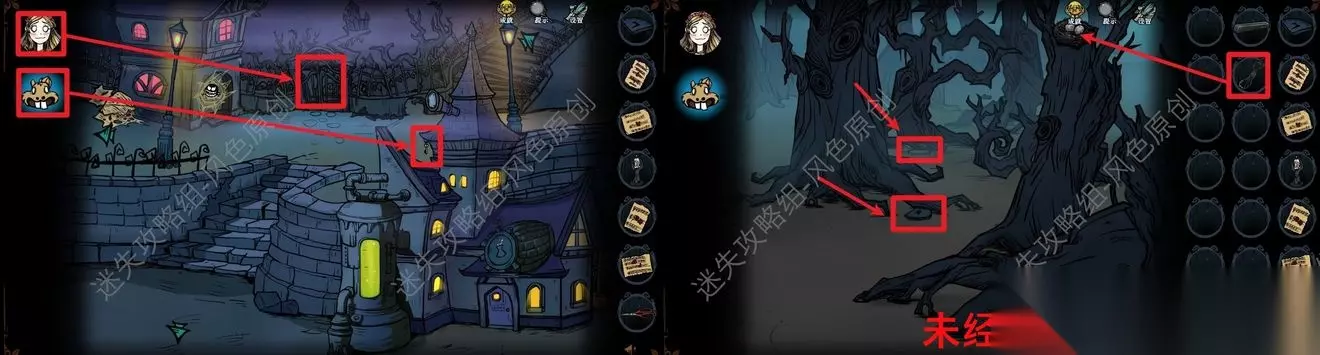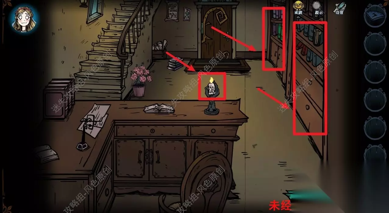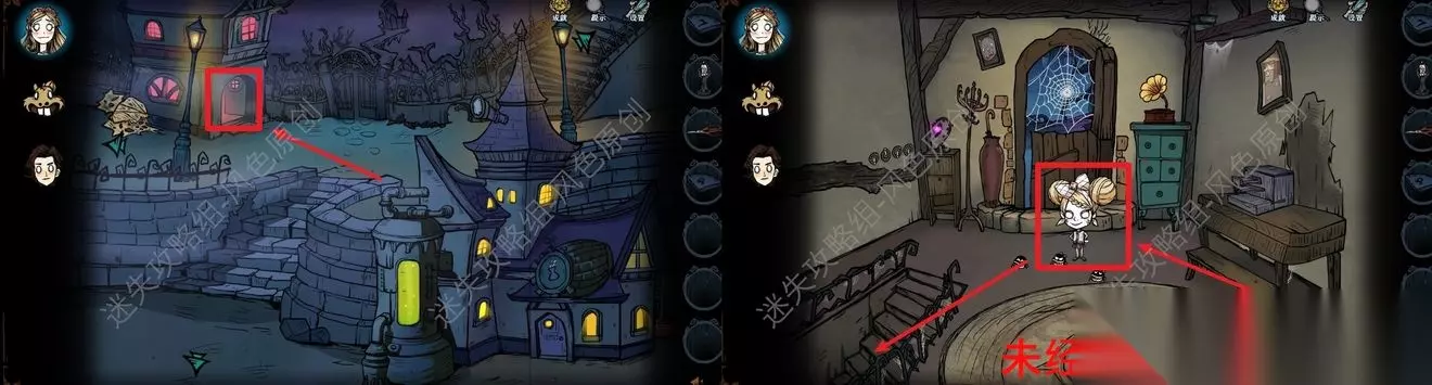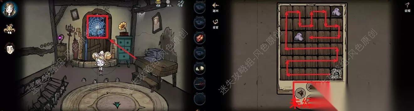77.点击道具栏中的【蜡烛】后,再点击场景,将场景照亮后,与蜘蛛对话,蜘蛛的右方可获取【奇怪的印记】,蜘蛛的左方可获取【发光的石头】,但是需要参与华容道小游戏并成功通关,如图所示通过移动格子将所有的红色石头都移动到红色框中即可通关。 77