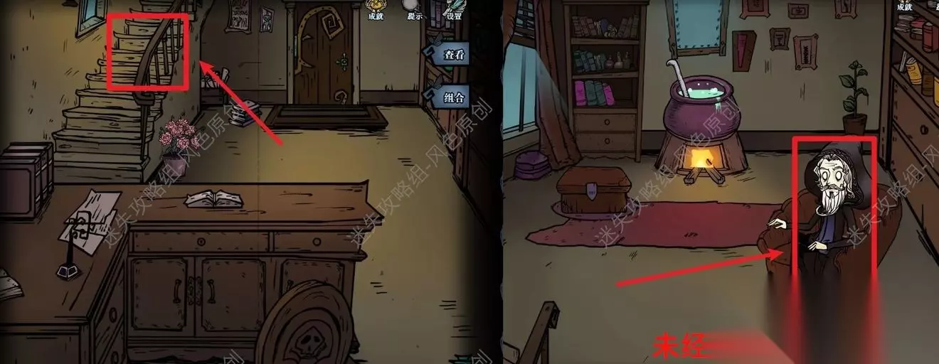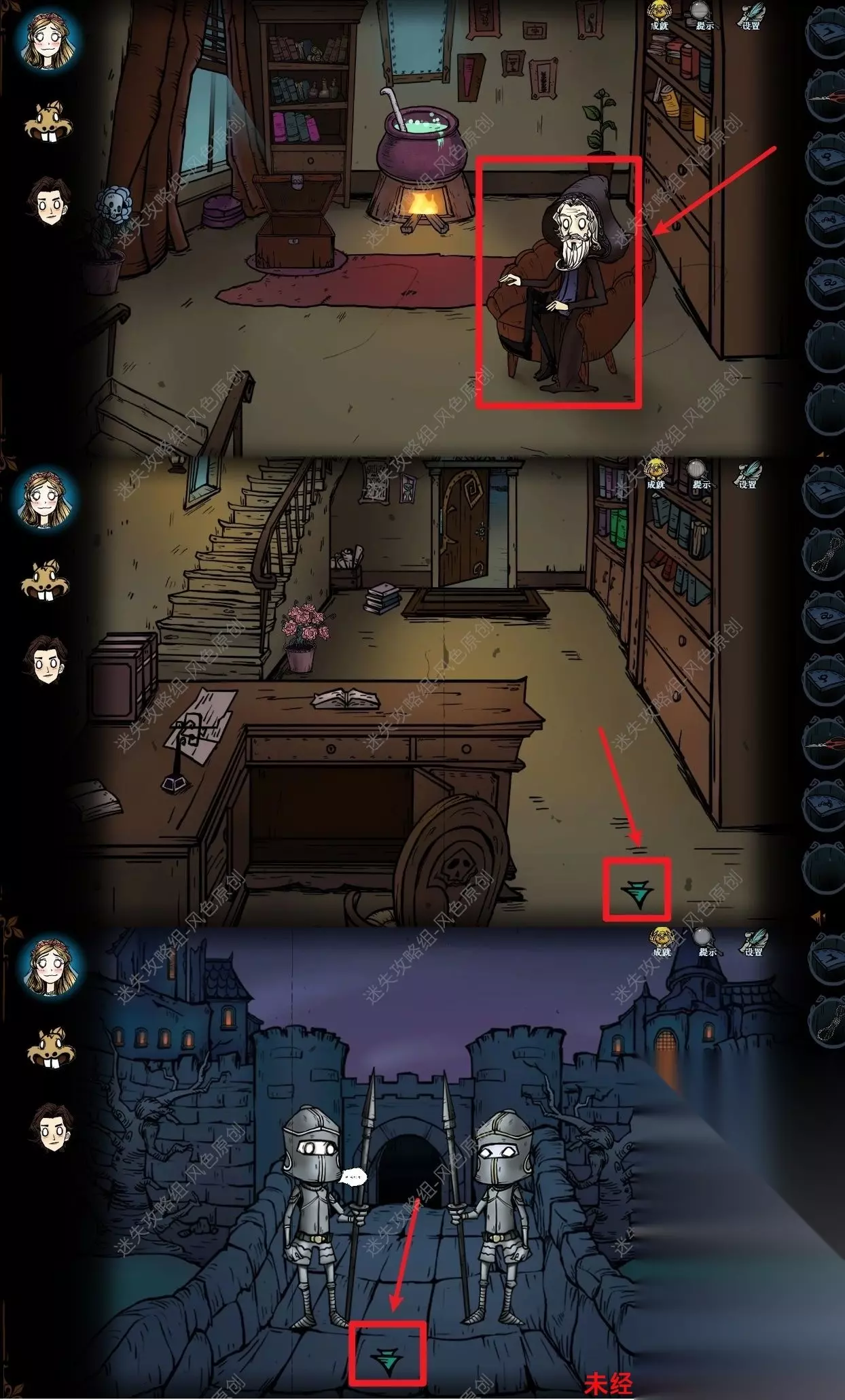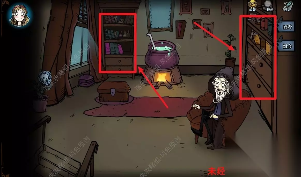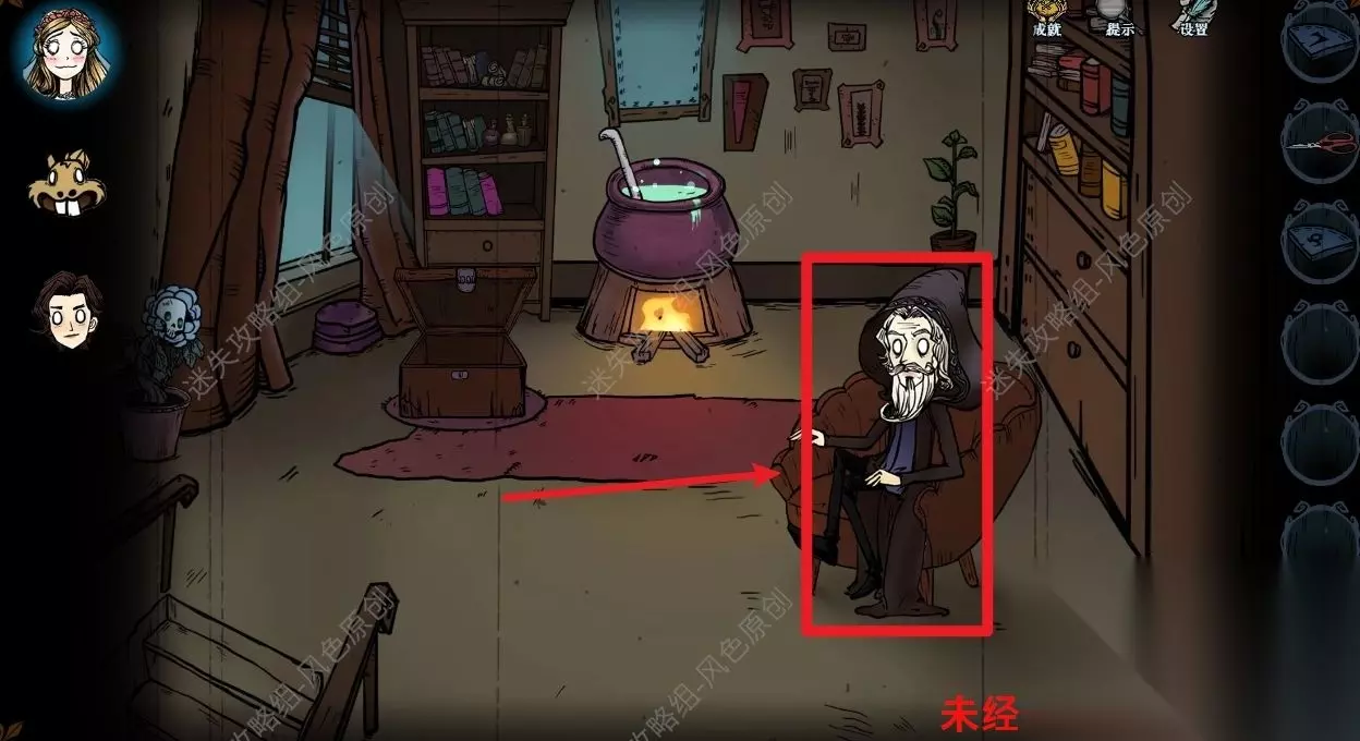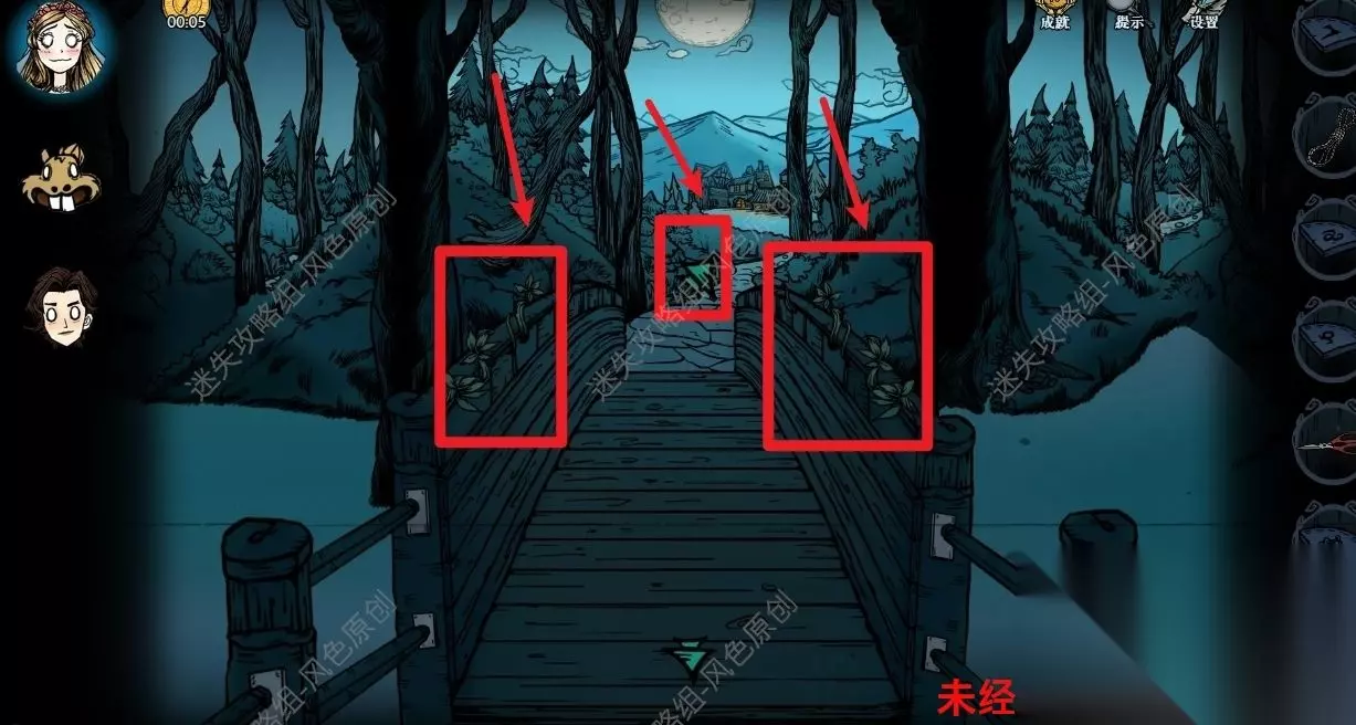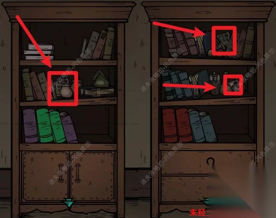 77.点击道具栏中的【蜡烛】后,再点击场景,将场景照亮后,与蜘蛛对话,蜘蛛的右方可获取【奇怪的印记】,蜘蛛的左方可获取【发光的石头】,但是需要参与华容道小游戏并成功通关,如图所示通过移动格子将所有的红色石头都移动到红色框中即可通关。 77