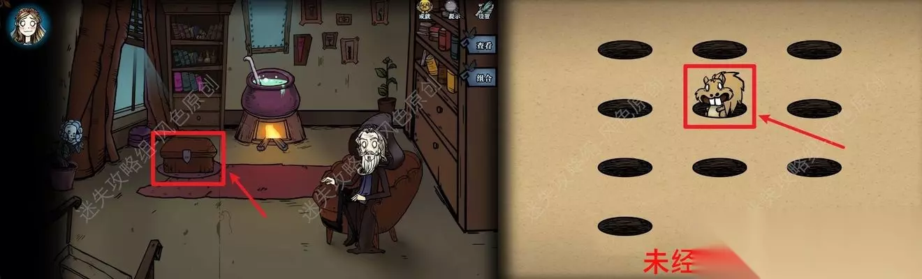69.点击场景中的箱子,与其中的松鼠进行对话,参与小游戏,小游戏中会连续出现不同颜色的松鼠,所有松鼠消失后点击黄色松鼠最后出现的洞口位置,连续点击正确八次,即可让松鼠奇奇加入队伍。 69