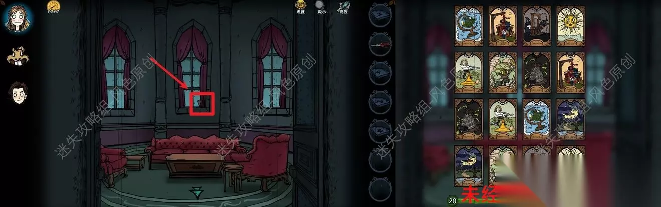 84.进入右上方的窗户中,点击图中所示位置,参与小游戏,在限制时间内找到所有成对的塔罗牌,完成小游戏后可获取【塔罗牌:世界】。 84
