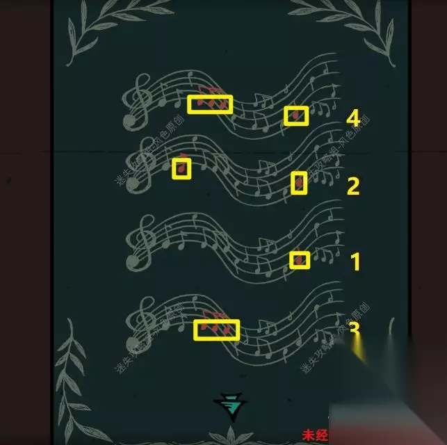 73.切换场景,在下图场景中点击钢琴,将【黑色琴键】与【白色琴键】安装在钢琴缺失的键位上。 并根据此前的乐符提示,查看道具栏中的四张【一部分乐谱】,可看到乐谱中的乐符的点的数量也是对应的1到4个,按照之前4213的提示,将四张【一部分乐谱】按照乐符点数量的顺序从左到右摆放进入钢琴上的四个凹槽中。参与音游小游戏,在黑色方块掉落在下方区域时及时按下对应的按键消除掉,成功通关小游戏后触发菲利普的出现。 73 73.1