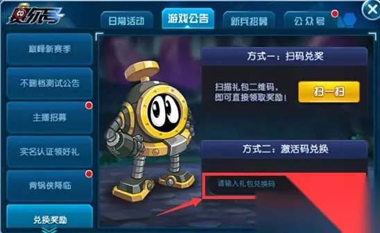 2、点击进入活动页面之后,点击上方游戏公告。 3、在从左侧可以找到【兑换奖励】按钮选项,点击对应按钮。 4、在兑换界面中的兑换码输入框中填写兑换码,最后点击兑换奖励即可获取游戏奖励物品。