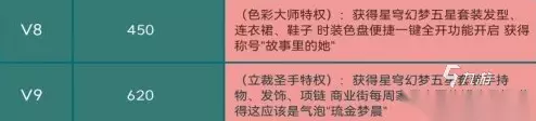 充值620元达到V9,可以解锁全部的星穹幻梦套装,时装色盘也能够一键全开,还有文字称号“故事里的她”,还可以解锁商业街里每周家居小栗礼罐的购买权。