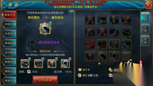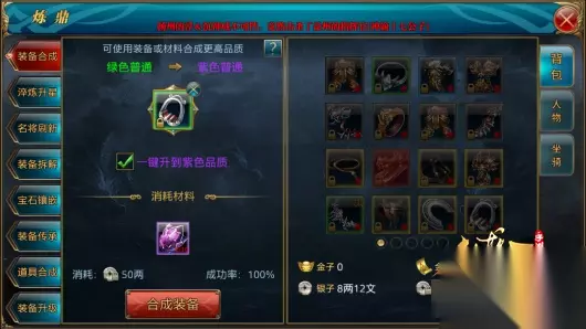 坐骑装备合成 在副本“单骑救主”中只掉落黄色和绿色坐骑装备,获得紫色坐骑装备的途径有合成、世界BOSS掉落、NPC兑换。在炼鼎装备合成中提升马装的品质,马装的合成和人物装备的合成方法一样,低品质的装备可以合成出来更高品质的装备,合成装备需要一件主装备和四件辅装备。此外,还可以使用紫色精铁作为材料,直接将非紫色的装备直接升级为普通紫色,合成一次需要10个紫色晶石。而精良紫色马装和极品紫色马装,仍然是需要用四件紫色的辅装备合出来的。