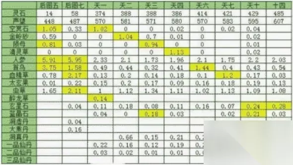 想不想修真材料掉落表大全一览 草药材料掉落介绍: 千年人参:炼丹的重要材料,在所有地图上都有出产,道童也会给予。如果频繁刷图而炼丹不频繁,人参会逐渐增多。但是,如果某些丹药大量制作,人参可能会不够用。因此,建议至少保留六组人参,以备不时之需。如果人参数量过多,可以考虑兑换灵液。 千年虫草:也是炼丹的重要材料,所有地图都有出产。它是制作体魄丹、加妖攻的镇妖丹和加鬼攻的天罡丹的主要材料。如果这三种丹药都炼制的话,虫草可能会不够用。因此,不建议出售虫草或兑换灵液。 千年何首乌:所有地图都有出产,图五的产出量尤其大。它是养魂丹的材料之一,也是加攻击的洗髓丹和加闪避的灵动丹的主要材料之一。道童也会出产何首乌,在资源不紧张的时候可以适当兑换一些灵液,但建议保留至少三组以备不时之需。 太玄果:主要在图五之后的地图上低几率出产,太安天的几率稍微大一点。它是七转金丹的主要材料,因此一个都不要卖掉。否则之后想要获取会非常费劲。 血精草:地上图7的产出量最大,天上所有地图都出一点点。它也是一品仙丹的主要材料之一,浑天练完之后如果还有剩余,可以考虑兑换灵液。因为一品仙丹的另一个材料获取难度较大。 轻灵草:一品仙丹的主要材料之一,一次需要一组。无思天的掉率稍微高一点,不过相对于一次一组的需求量还是太少了。不用专门去刷取,只要在刷图过程中留意一下即可。 醉龙草:七转金丹的主要材料之一,天一的掉率稍微高一点。有了丹方之后再专门刷取即可,不要卖掉。 往生莲:七转金丹的主要材料之一,只有道童会出产。因此无法通过刷图获取,所以即使背包满了也要留着,不要兑换成灵液。 活气果、阴神花、伴妖草、鬼滕花:除了用于炼制丹药外,目前没有其他明确用途。推测这些是以后仙丹的材料,建议保留一些以备不时之需。