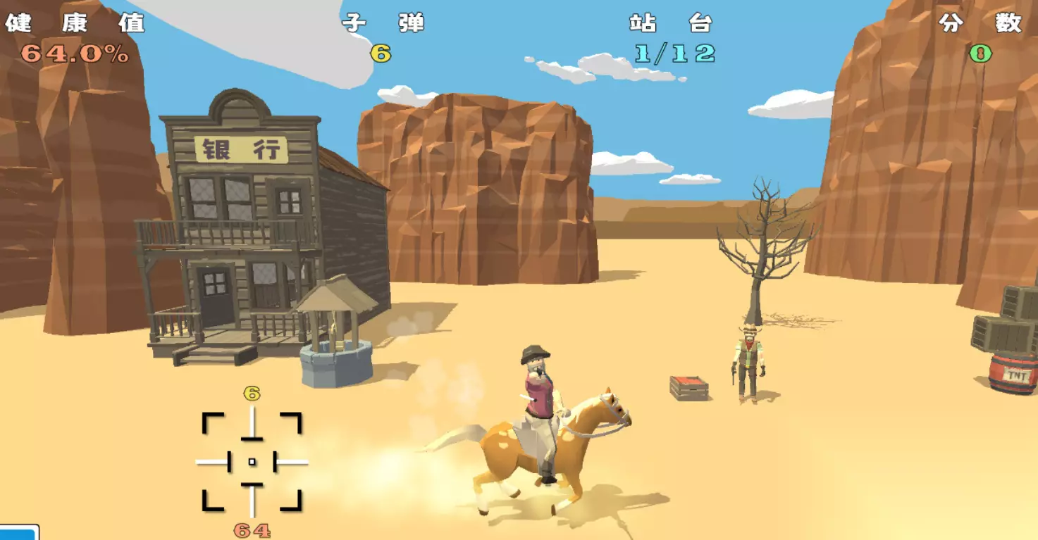 这是一款像素风第一人称射击游戏,以极简美术承载高密度玩法。左轮手枪单发威力强但装弹慢,玩家需在有限子弹内完成多目标清除,考验瞬时决策与准星控制。场景设定于烈日灼烧的荒漠地带,动态沙尘效果与低多边形建模形成独特视觉张力。任务类型涵盖靶场训练、通缉追捕、限时突围等,结构紧凑且无重复疲劳感。 手机扫码下载233乐园APP预约 预约订阅最新动态 优先233乐园APP下载 5、《牛仔对决》