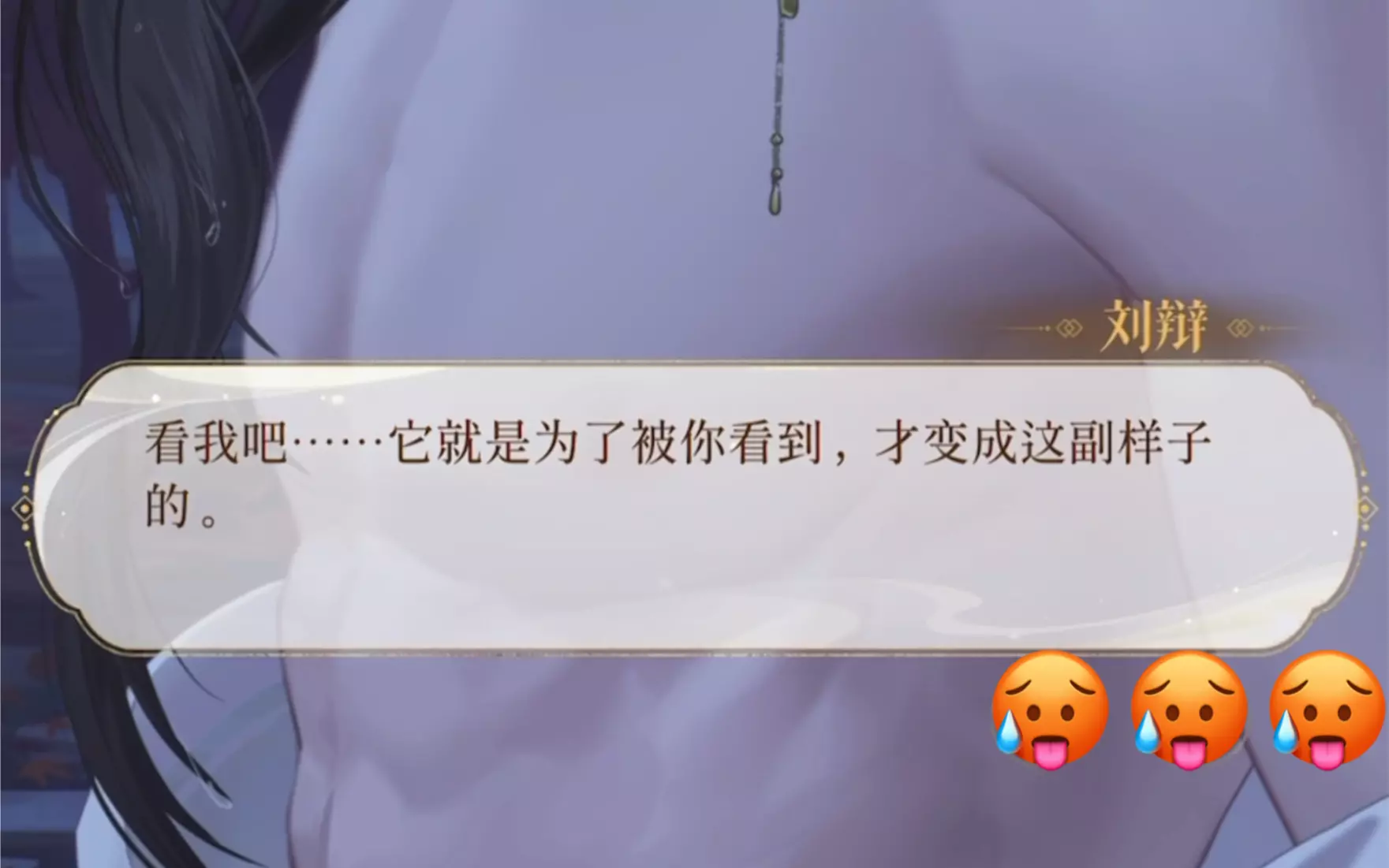 这是一则游戏剧情向内容,展示了角色刘辩的一段气话剧情:他先是口是心非地说从未喜欢对方,随后又服软认错,恳求不要留下自己一人,呈现出傲娇又脆弱的反差感。