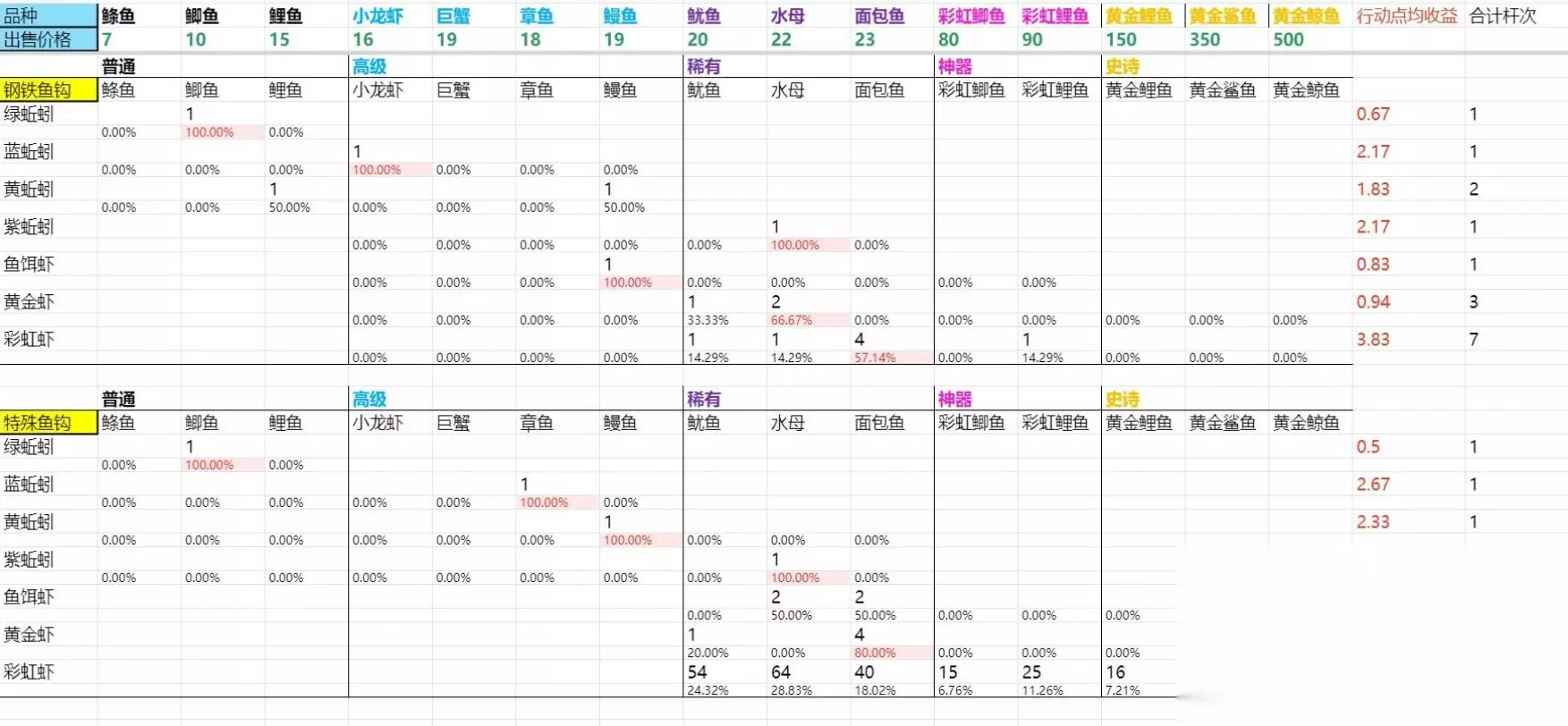 结论是黄蚯蚓YYDS 钓鱼4本利润及耕田比对 本来看下来也不纷乱对吧,有点耐性就能过3本坎了。那来看下4本的钩子鱼饵利润。 3本还是3钩,4本就特么5钩了,我紧要疑心策动没好好做5本,因陋就简。。 一开始觉得钢铁鱼钩会有甚么稀奇配合出好对象,最后觉察并没有,每杆就比特别鱼钩低廉5毛,杆效益都不如棉花。 因而除了我这种尝试的,往后哪个大冤种会去买钢铁鱼钩啊,第四个钩子生计的事理?? 4本池子是我和另一只渔友一块儿统计的。@风烟沐雨 最开始的时刻点数均效益在13+,跟着鱿鱼和水母的增进,目前平稳在11+,在跌下11的时刻总有金沙鱼会跑出来救场。 一条金沙鱼就能顶种5.5个棉花的收入。(棉花为农事最高收入作物,60点体力全日也就种5个棉花)
