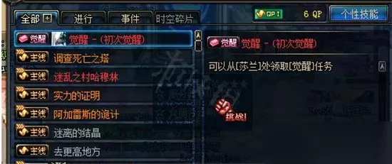 dnf一觉任务在哪里接 主线推进接取。 改版之后一觉任务完全和之前不一样了,50级之后玩家会接到相应的主线觉醒任务,而不是npc上领取觉醒任务了。主线任务会让你打一次痛苦之存列瑟芬,也是就是真猪副本。没有任何难度,就是一个象征性让你过一下的本。完成任务之后玩家可以进入职业专属觉醒地下城 通关觉醒地下城即可完成觉醒,不再需要以前的通关死亡塔,不需要收集材料。 需要注意的是,玩家如果有升级券的话,一定要在50级停下来不要使用,先完成觉醒任务之后在进行使用。不然的话你的主线觉醒任务会被直接跳过,你就只能再从新做老版本的觉醒任务了。 老版本觉醒任务流程: 1、50级之后,系统任务中自动弹出觉醒任务。在西海岸莎兰处接任务。 2、第一个任务是收集红白两色大晶体各10个。一般可以直接去拍卖或者交易市场买。拍卖会比较便宜。晶块是平时分解装备得到的,要注意收集,以后还会有用处。在赛利亚处也可以合成大晶体。不过比较贵。不要用无色合成其他颜色,太不划算了。其余任务跟着任务栏找npc就可以完成。