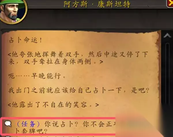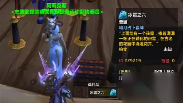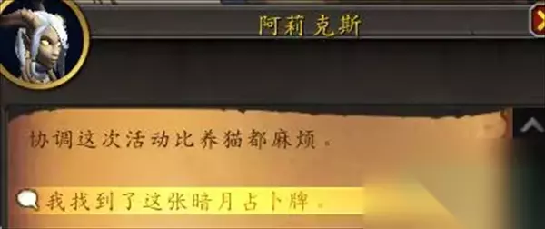 魔兽世界卡牌纷乱任务怎么做? 答:帮助NPC寻找其他9张卡牌即可达成 1、领取任务后寻找NPC阿莉克斯,接着在后面的箱子里拾取暗月占卜牌