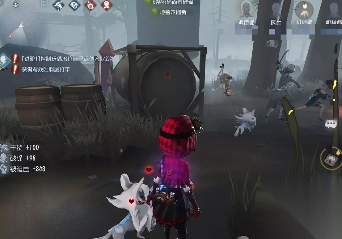 机械师在破译完两台密码机后基本完成了自己的破译任务,娃娃去贴门或者补机子,本体可以考虑进行一波救援,不过我们都选机械师了,很少有安心修机的时候,所以牵制也很重要。作为机械师,我们要选择在一个安全的点位,机械师一溜有两种玩法,第一种是开局放娃,把娃藏在附近可以卡耳鸣,也可以在后续被击倒后破译,也可以开局不放娃,利用娃娃进行抗刀操作,娃娃会固定出生于机械身后,这样就能帮我们挡刀。一局游戏可以召唤两个娃娃,直接用娃娃抗两刀,所以机械师的牵制强度同样不低。手上没有技能后就是正常思路,开局可以先拉点,主动寻求辅助位的帮助,作为白板尽力牵制即可,如果娃娃还在外面,机械师上椅子也能给团队争取一定破译进度,事实上,娃娃能干的事情比机械师多,特别是在后期,作为一个白板角色,会给团队带来负提升。本体后期修也修不动,溜也不好溜,因此娃娃对机械师非常重要,如果不是开局死抓,尽量不要让娃娃被打亏损。 第五人格实用攻略