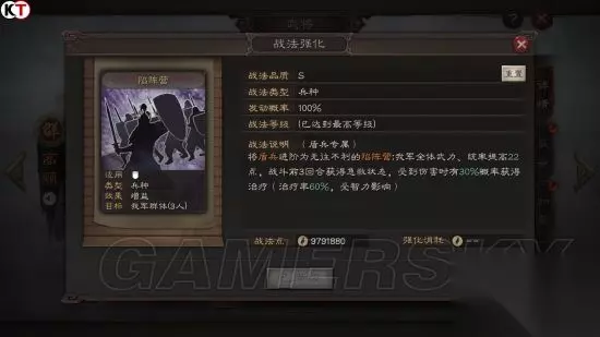 满级战法 陷阵营是吕布手下大将高顺的部队,仅700余人,但每一名士兵都是千挑万选出来的精锐,并且装备精良,拥有高度的纪律性。这支部队曾击败拥有关张的刘备军,但随着吕布被杀,高顺引颈受死,陷阵营也不知所踪。 游戏中,陷阵营为高顺的自带和传承战法,为盾兵的进阶兵种。 满级效果:将盾兵进阶为无往不利的陷阵营;我军全体武力、统率提高22点,战斗前3回合获得急救状态,受到伤害时有30%概率获得治疗(治疗率60%,受智力影响) 西凉铁骑