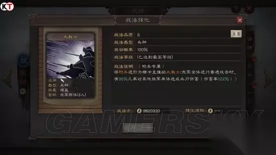 满级战法 大戟士为袁绍的精英部队,每位士兵都配备着大戟和重甲,百里挑一。后被公孙瓒的白马义从克制。 游戏中大戟士为张郃的自带和传承战法,由枪兵进阶。 满级效果:将枪兵进阶为横冲直撞的大戟士;我军全体进行普通攻击时,有35%几率对其他敌军单体造成兵刃伤害(伤害率122%)