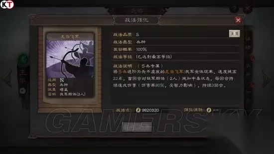 满级战法 无当飞军为诸葛亮利用当地蛮夷兵源,所组建的一支劲旅。这是部队皆身披铁甲,能翻山越岭,善于使用弓弩和毒箭,尤其精于防守作战。为蜀军北伐做出了突出贡献。 游戏中无当飞军是武将王平的自带和传承战法,由弓兵进阶而成,可使全军提高统率和速度,并于首回合对敌军施加中毒状态。 满级效果:将弓兵进阶为矢不虚发的无当飞军; 大戟士
