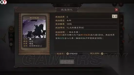 满级战法 西凉产马,自古就有“凉州战马,横行天下”的说法。西凉铁骑周身精钢铁甲,曾出现在董卓,马腾和马超的手中。而西凉军悍不畏死,骁勇善战。马超凭借西凉军与曹操六战渭水,杀的曹操割须弃袍而逃。 游戏中,西凉铁骑为马腾的自带和传承战法,由骑兵进阶而成。 满级效果:将骑兵进阶为横行天下的西凉铁骑;战斗前3回合,提高我军全体22%会心几率(触发时兵刃伤害提高100%) 虎豹骑
