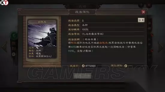 满级战法 白毦兵长期以来鲜为人知,白毦为戟饰,据传白毦兵为西方上兵,很有可能是少数民族的兵种。 游戏中白毦兵为陈到的自带和传承战法,由枪兵进阶而成。 满级效果:将枪兵进阶为攻无不破的白毦兵;我军全体战斗中的普通攻击后有40%概率对攻击目标再次发起一次谋略攻击(伤害率110%,受智力影响) 无当飞军