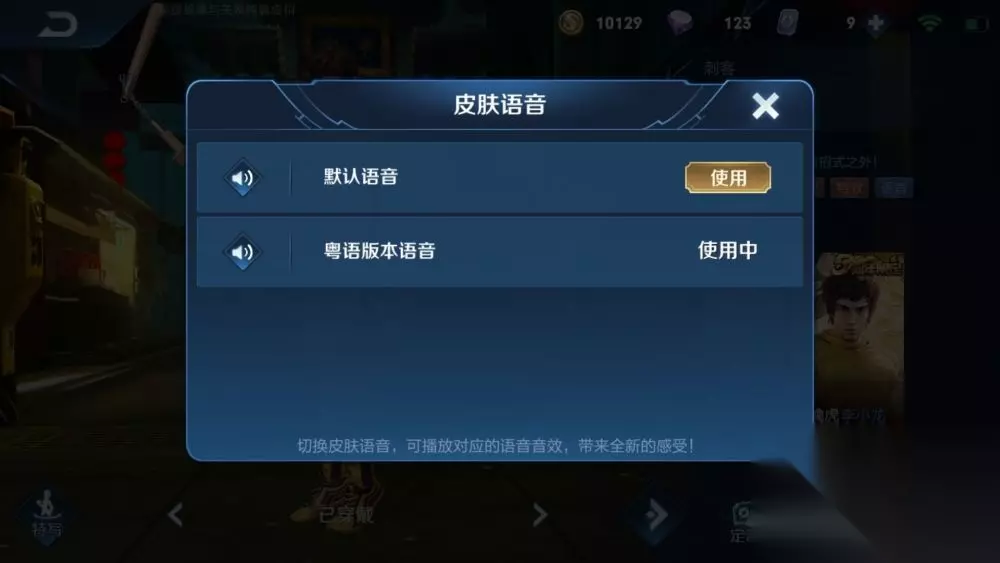 第三步:皮肤切换到【李小龙】,在已经拥有粤语版语音包的情况下,可以看到定制右边有一个【语音】按钮,点击【语音】。