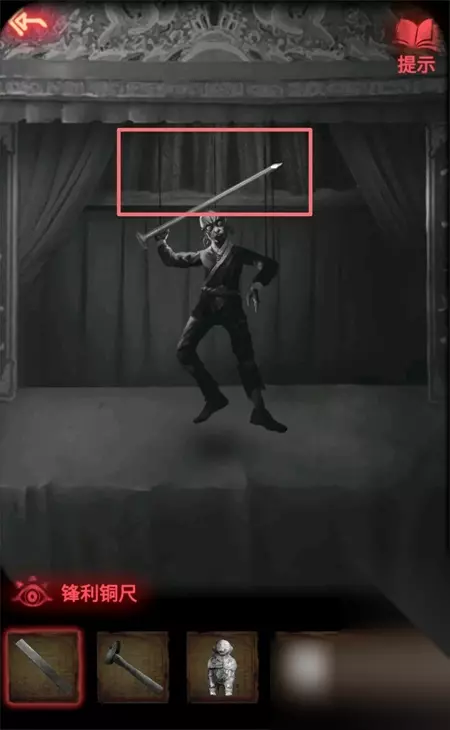 17、点击右侧的戏台使用铜尺将木偶线割断获得钉子。