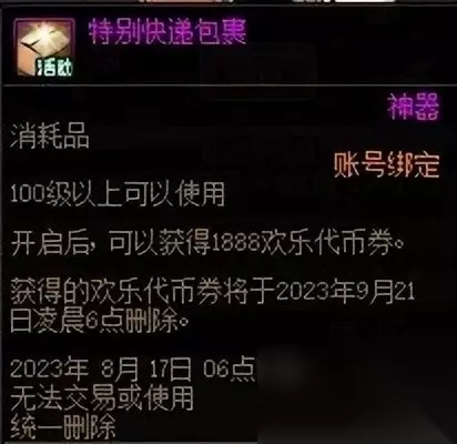[特别快递包裹]中有1888欢乐代币券,需要100级以上的角色打开使用,获得的欢乐代币券将于2023年9月21日删除。