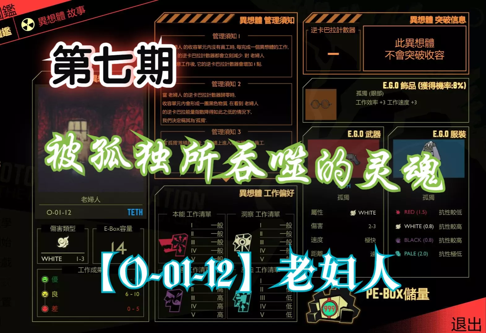 这是一篇脑叶公司异想体“老妇人O-01-12”的教学帖,为新人主管带来易懂的管理方案,介绍了该异想体的推荐等级、工作偏好、管理须知、危险等级等信息,它安全易管理。