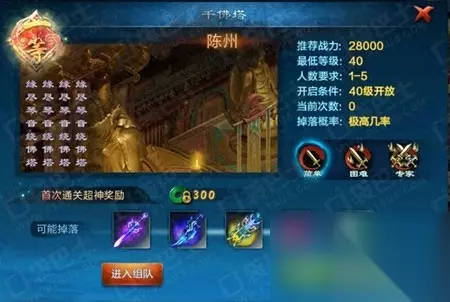 副本进入条件: 1、玩家等级达到40级即可开启千佛塔副本。 2、千佛塔副本位于陈州,玩家可通过活动-日常副本前往。副本一共分为三个难度,以超神评价通关副本即可开启下一个难度。 3、千佛塔副本主要产出40级武器升级材料、40级洗炼石、7-9阶武器、防具、首饰强化符。 233乐园站所有文章资讯、展示的图片素材等内容均为注册用户上传(部分报媒/平媒内容转载自网络合作媒体),仅供学习参考。用户通过本站上传、发布的内容的知识产权归属用户或原始著作权人所有。如有侵犯您的版权,请联系我们反馈!本站将在三个工作日内改正。