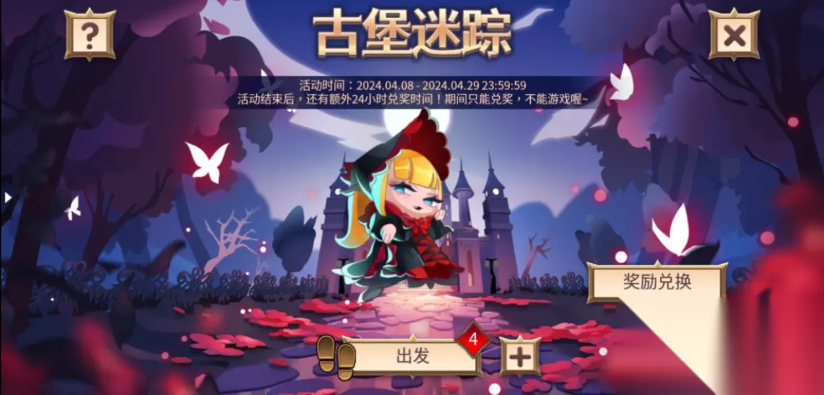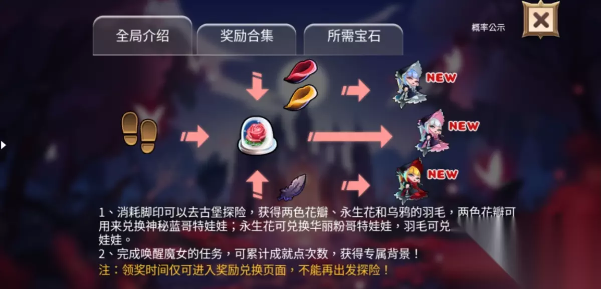 古堡迷踪活动上线啦!森林深处隐藏着一座神秘的古堡,让我们跟随着3位神秘的哥特娃娃一起开启神秘的探险吧~ 一、出发 目标:获得两色花瓣、永生花和羽毛。