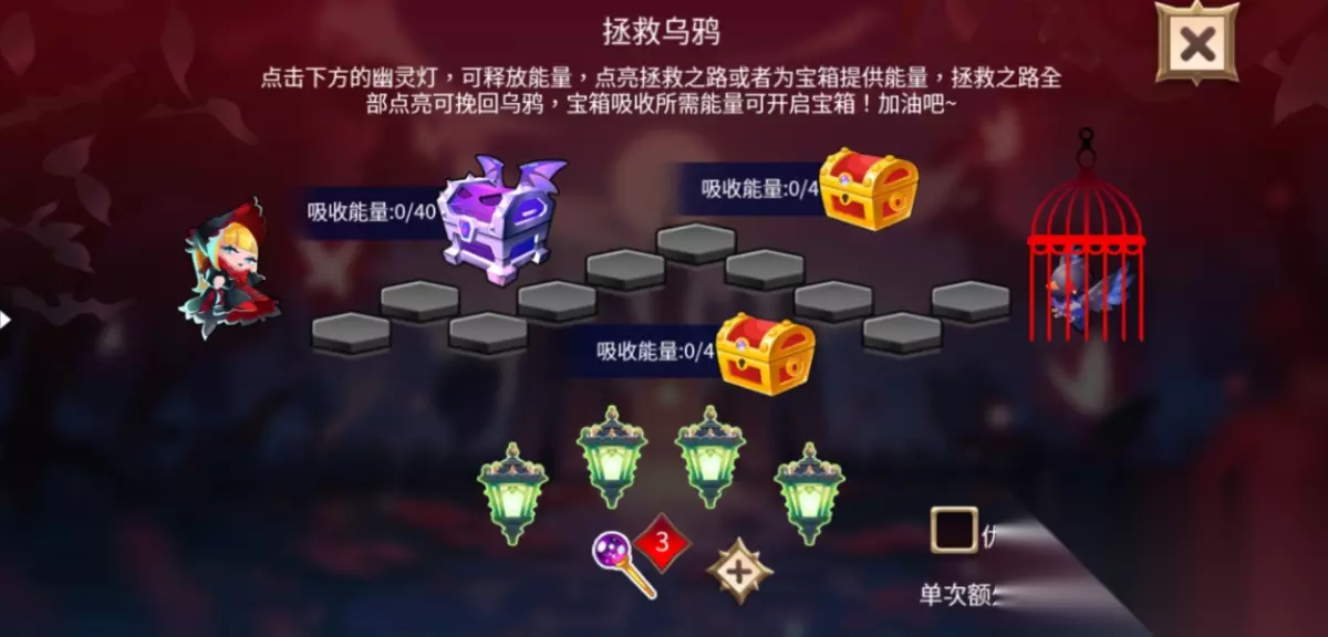 在前往古堡的路上有机会偶遇拯救乌鸦的玩法,点击下方的幽灵灯释放能力点亮拯救之路,全部点亮即可救出乌鸦。宝箱吸收满能量可以获得内部奖励。