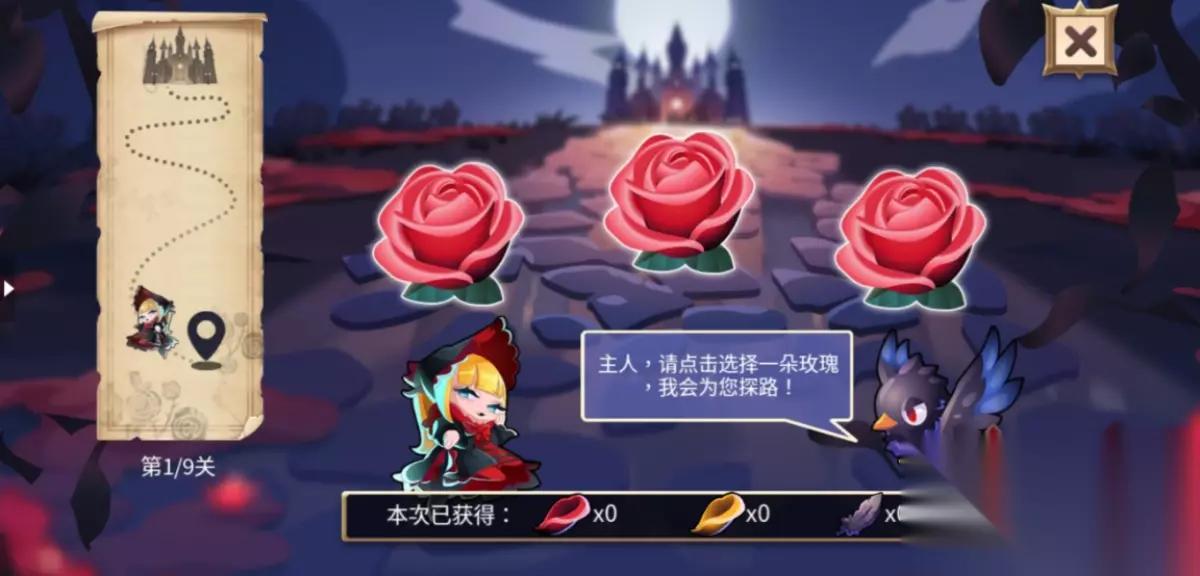 从玫瑰花中点击一朵玫瑰,乌鸦会帮助主人进行探路,前往古堡的路途上一共有9关,通过9关即可进入古堡。