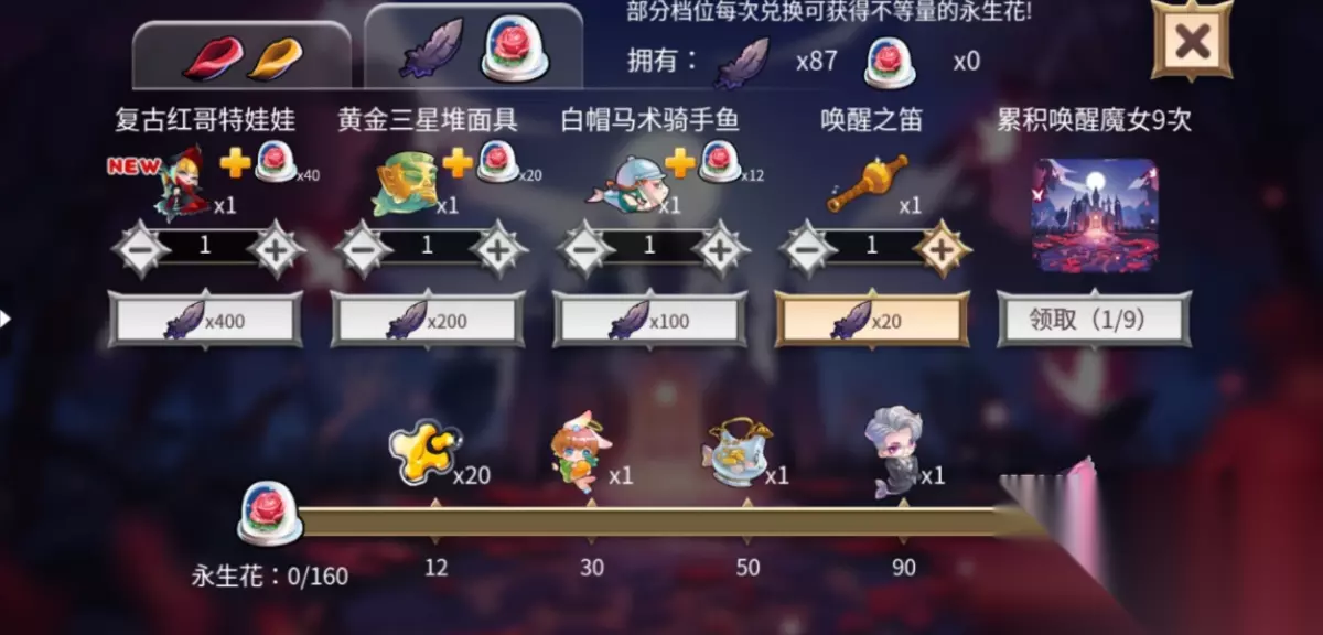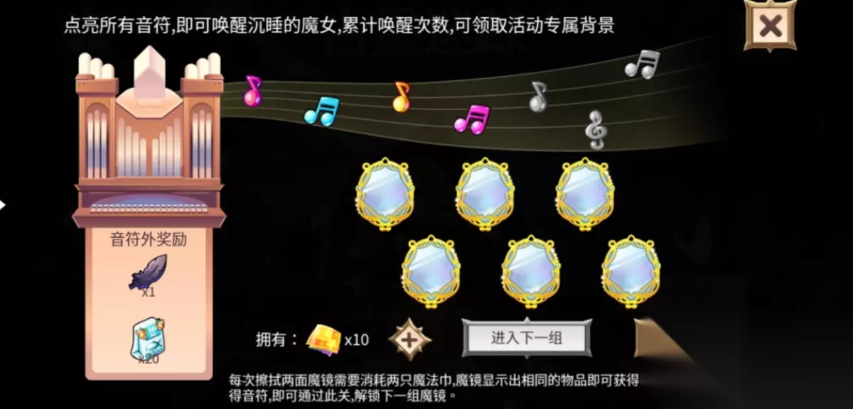 进入古堡后即可唤醒沉睡的魔女,使用魔法巾擦拭魔镜显示出相同的物品即可获得,找到藏于音符的魔镜即可获得音符进入下一关。点亮所有音符可以唤醒魔女,累次唤醒次数,可领取活动专属背景。 二、 奖励 兑换目标:兑换奖励。